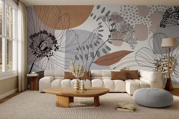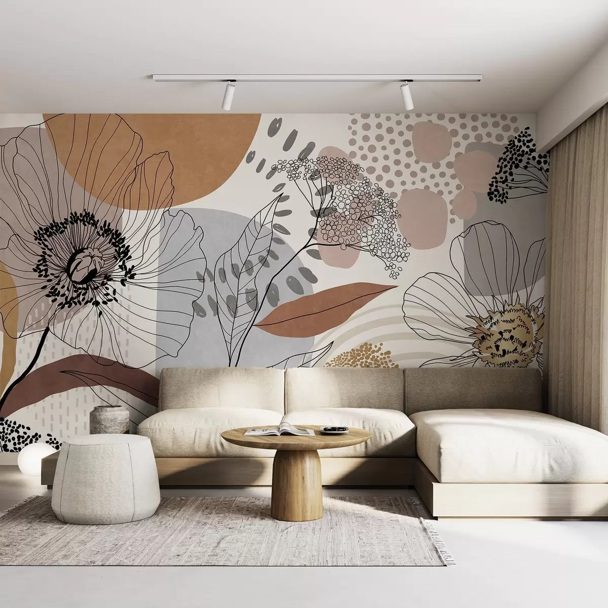 Тапете за зид Апстрактни цветни текстурирани отисак са линијском уметношћу цвећа, лишћа и органских облика у пригушеним смеђим, беж и сивим тоновима бр. w09548