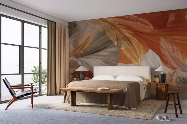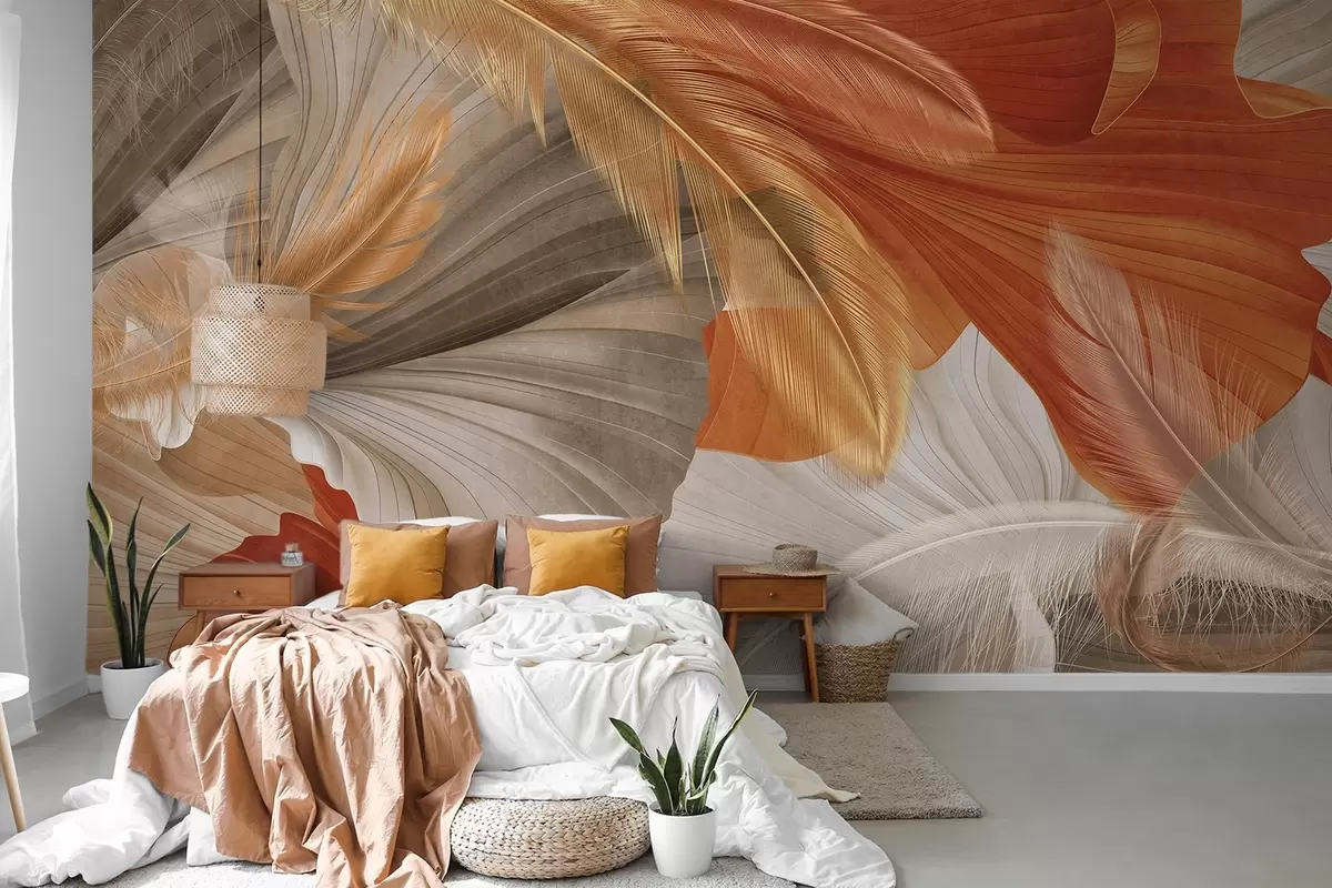 Тапете за зид Апстрактни текстурирани велики течни облици у крем и рђастим бојама са нежним, жутим, беж и смеђим перјем бр. w09549