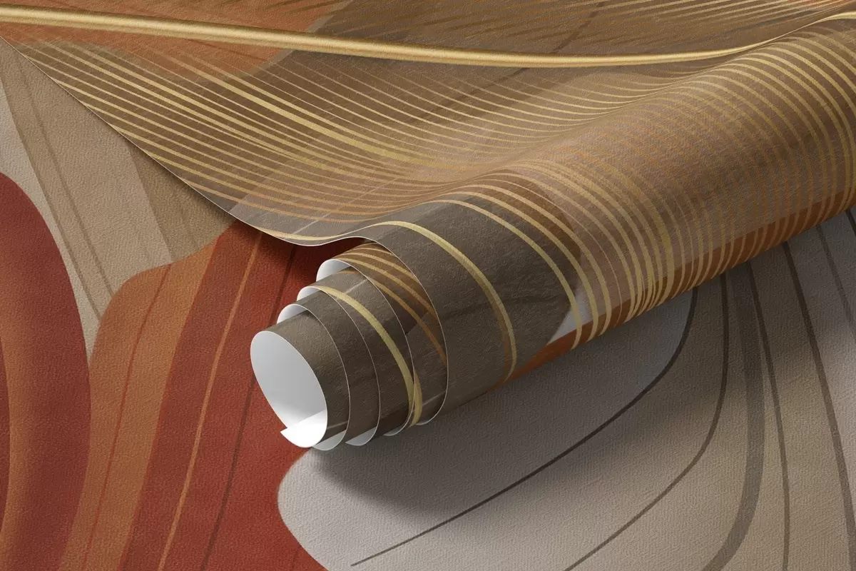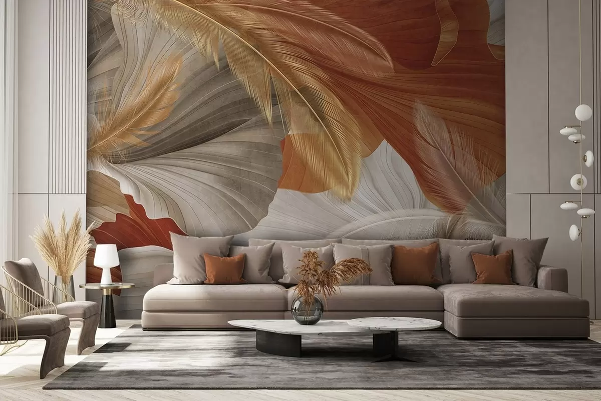 Тапете за зид Апстрактни текстурирани велики течни облици у крем и рђастим бојама са нежним, жутим, беж и смеђим перјем бр. w09549