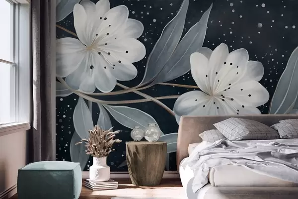 Тапете за зид Бели цветови са фантастичном текстуром, окружени плаво-зеленим листовима и гранама на тамној позадини бр. w09551