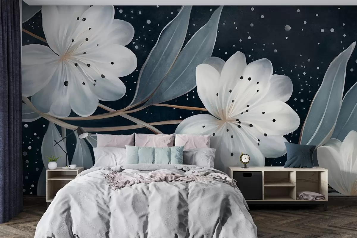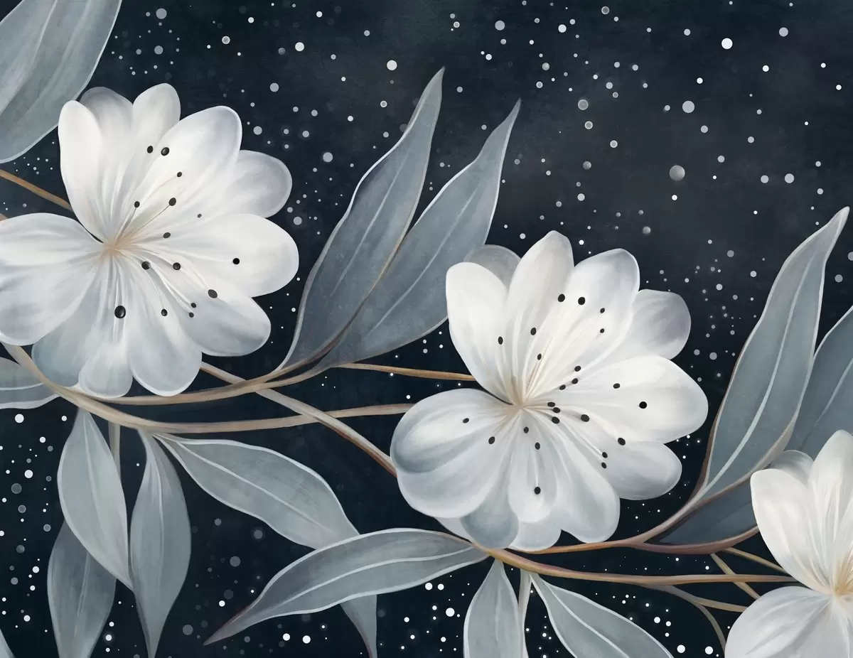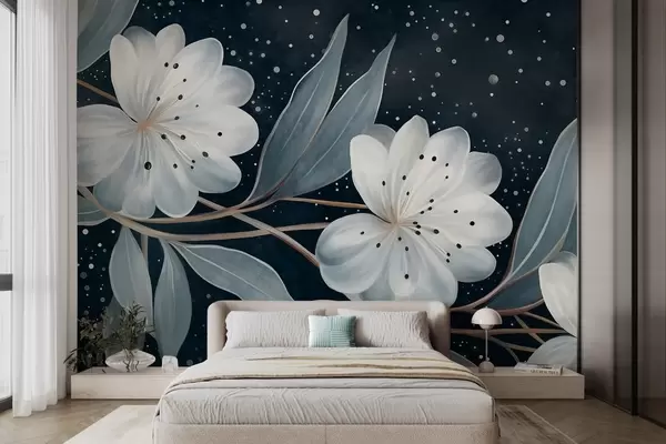 Тапете за зид Бели цветови са фантастичном текстуром, окружени плаво-зеленим листовима и гранама на тамној позадини бр. w09551