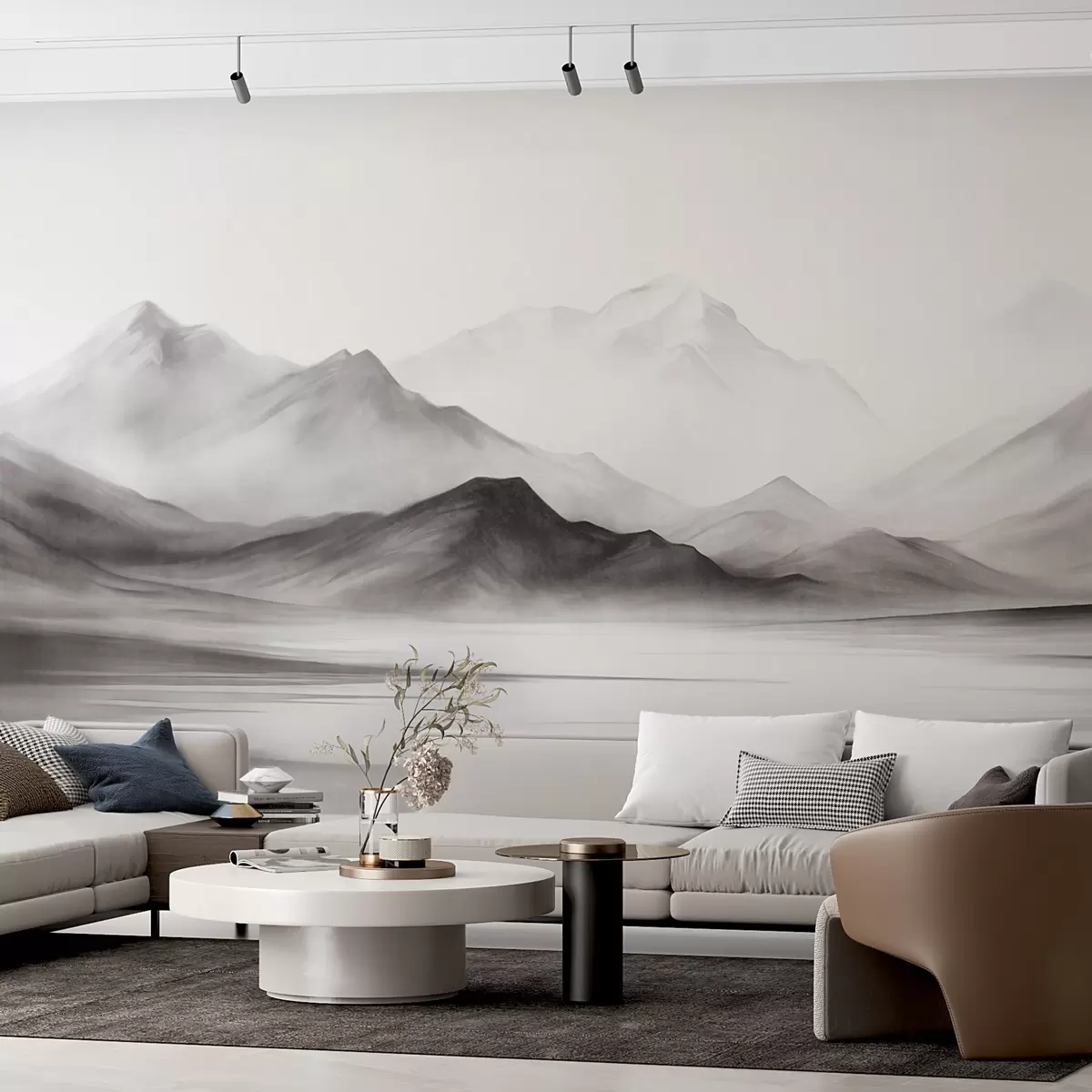 Тапете за зид Монохроматски текстурирани пејзаж са магловитим планинама и језером у првом плану бр. w09555