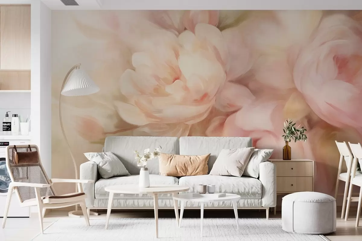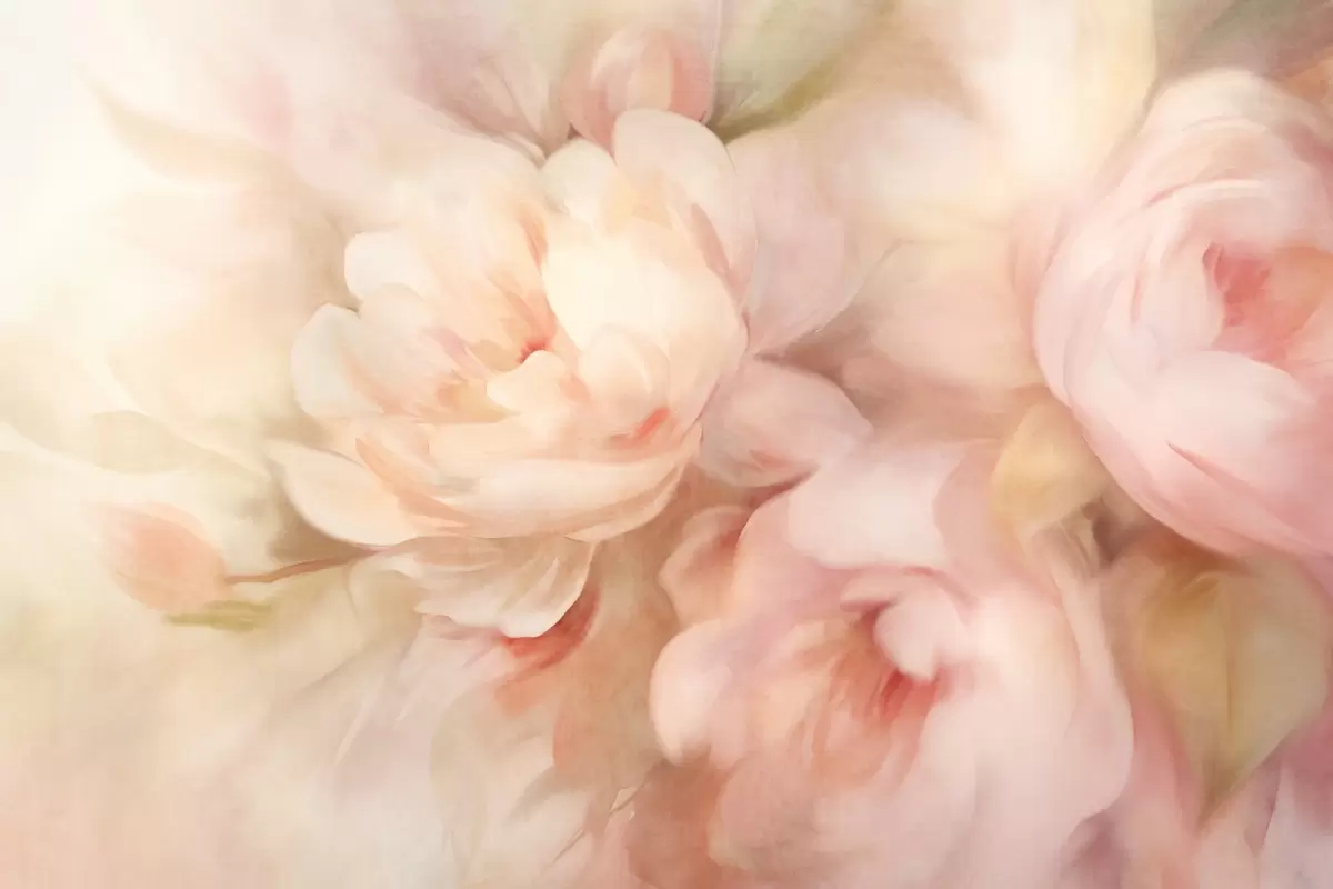 Тапете за зид Бледо ружичасти и кремасти божури са нежном, сликарском имитацијом потеза четкицом, стварајући текстурирани цветни аранжман бр. w09556