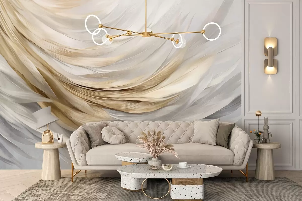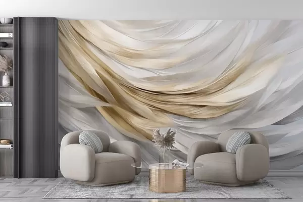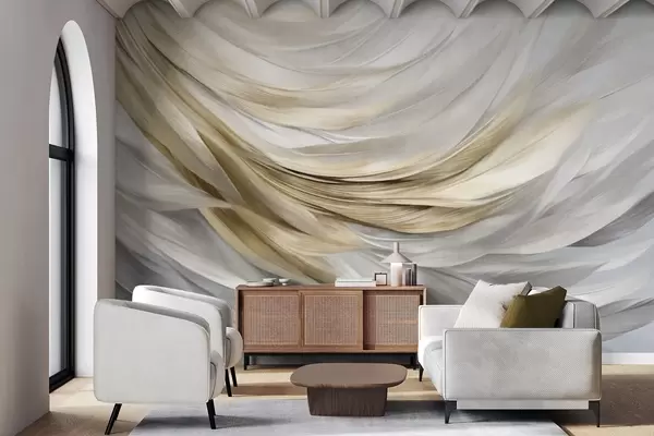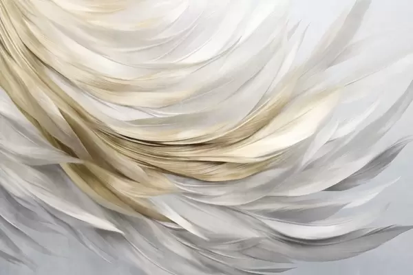 Тапете за зид Апстрактно текстурирано бело, сиво и жуто перје, стварајући текући, слојевити узорак на светлој позадини бр. w09557