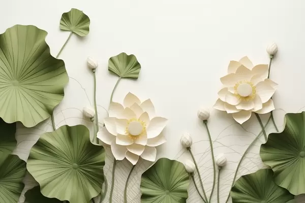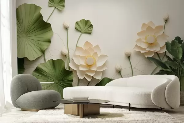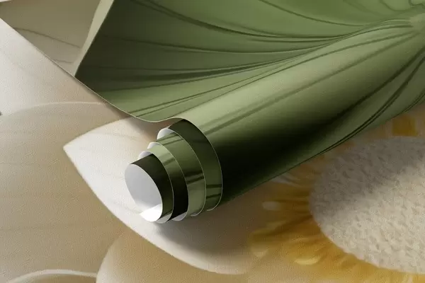 Тапете за зид 3Д цветови лотоса са зеленим текстурираним листовима, минималистички стил бр. w09560