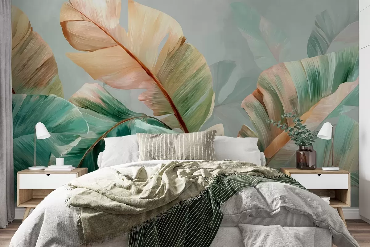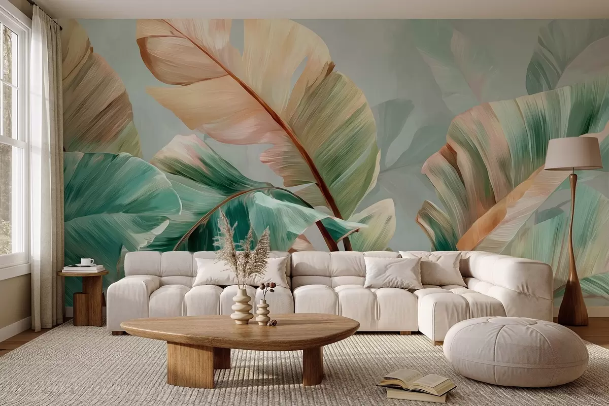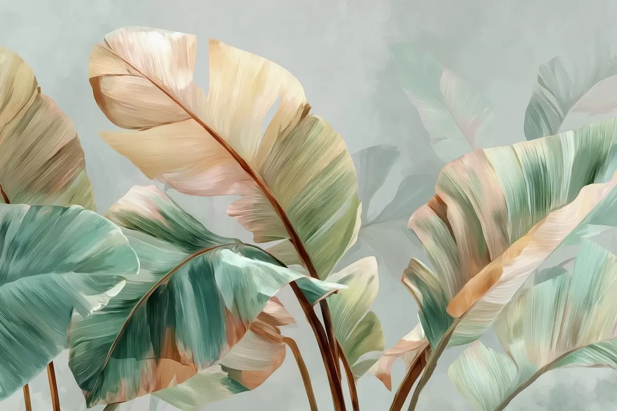 Тапете за зид Нежни тропски листови банане у пастелним жуто-зеленим тоновима бр. w09581