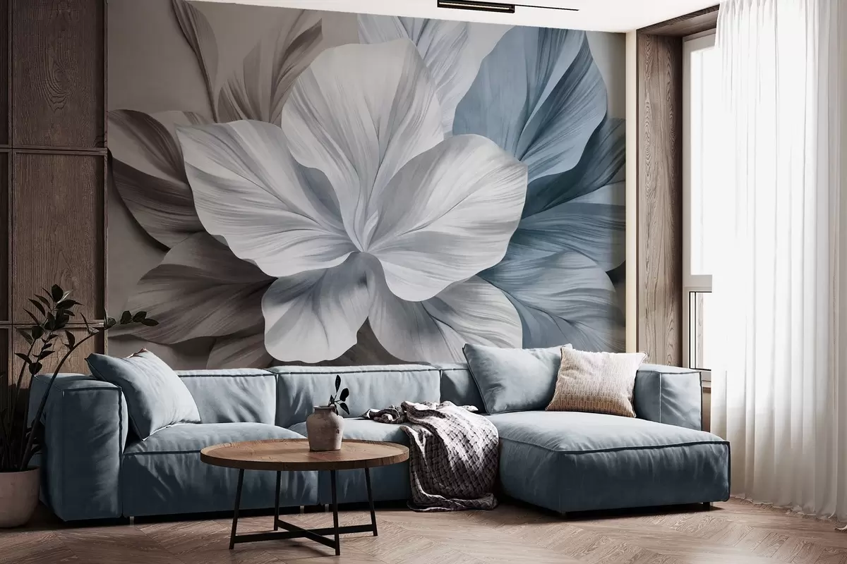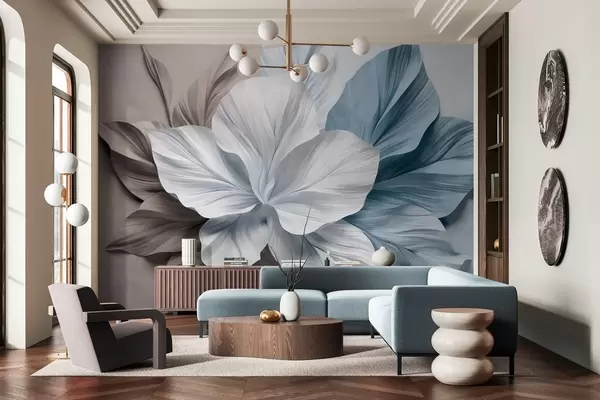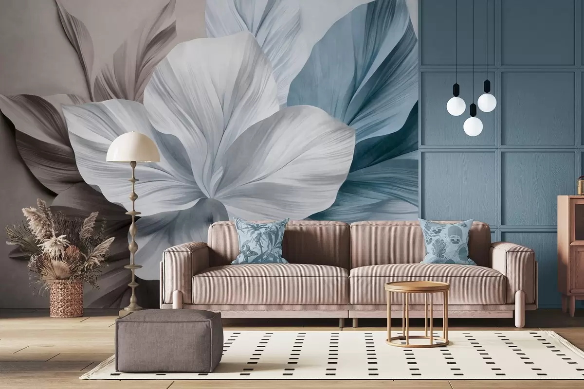 Тапете за зид Апстрактни цвет са више латица и текстурираним листовима у нијансама браон и плаве, мека позадина бр. w09604v1