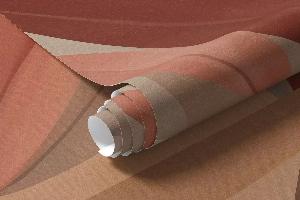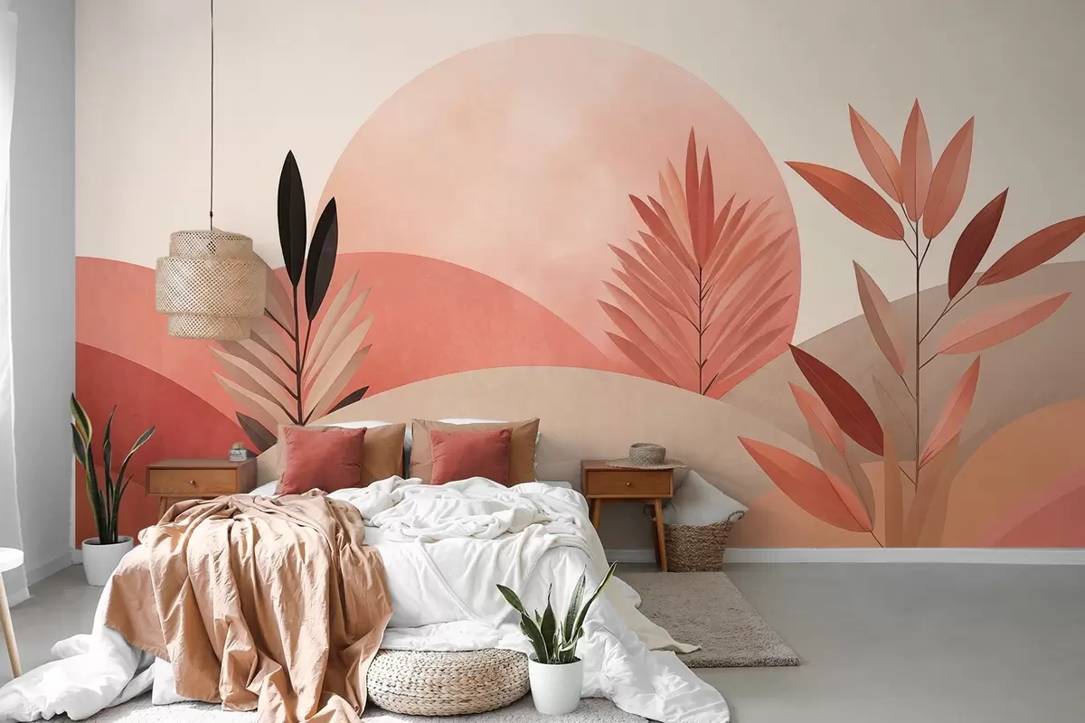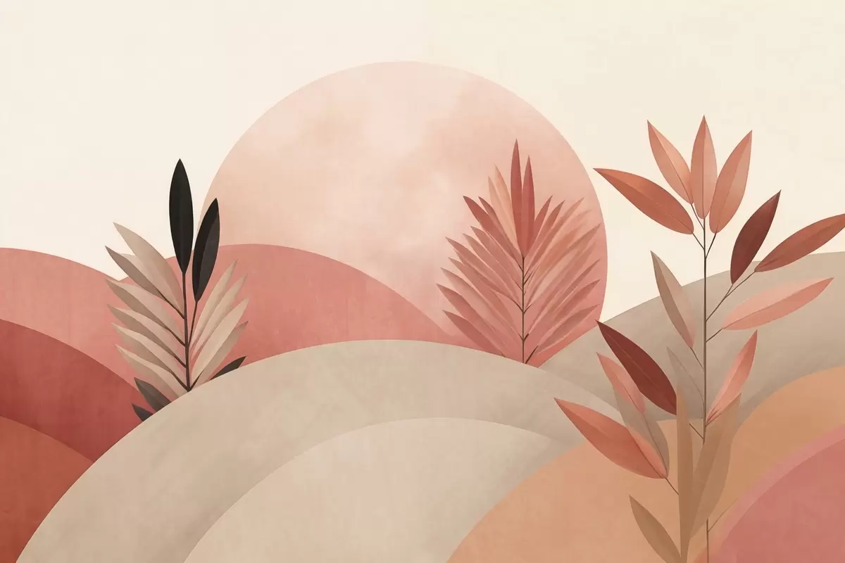 Тапете за зид Апстрактни бохо пејзаж, сунце иза валовитих брда, биљке у првом плану, минималистички, текстурирани, пригушене боје бр. w09608