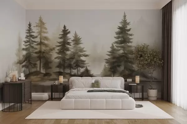 Тапете за зид Текстурирана магловита шума са високим боровима, имитација сликања бр. w09610