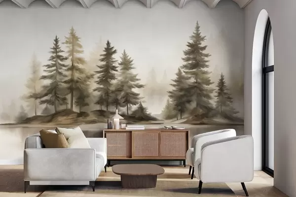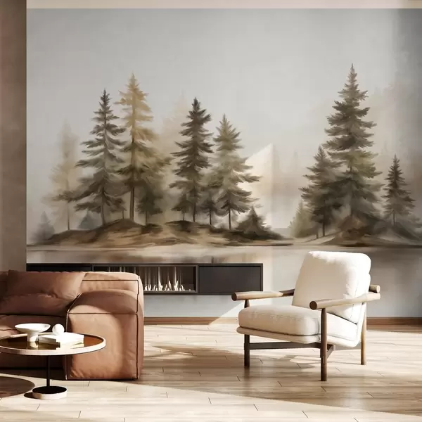 Тапете за зид Текстурирана магловита шума са високим боровима, имитација сликања бр. w09610