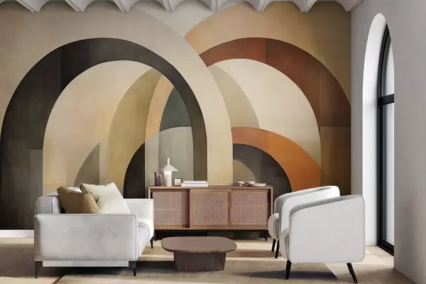Тапете за зид Апстрактни текстурирани геометријски лукови у земљаним тоновима беж, браон и сиве, слојевити модерни архитектонски дизајн бр. w09611