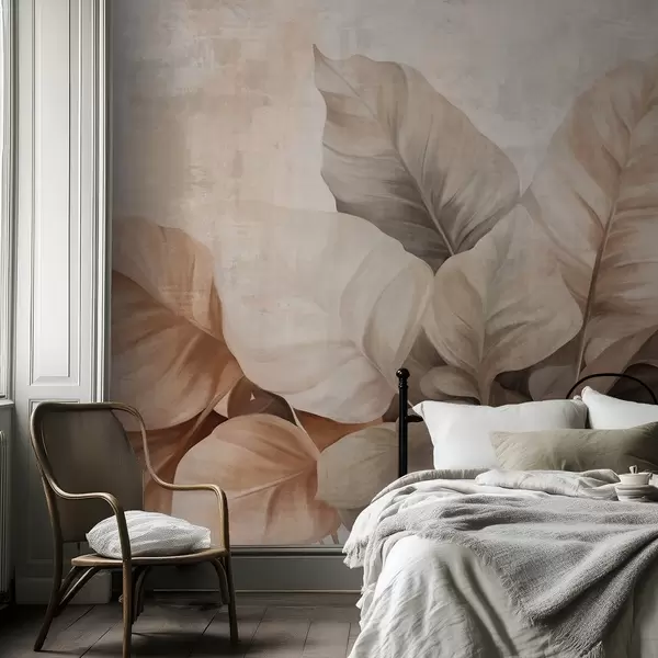 Тапете за зид Текстурирана имитација сликања великих, светло смеђих листова на неутралној позадини са суптилним потезима четкице бр. w09614