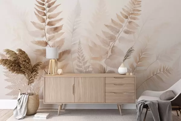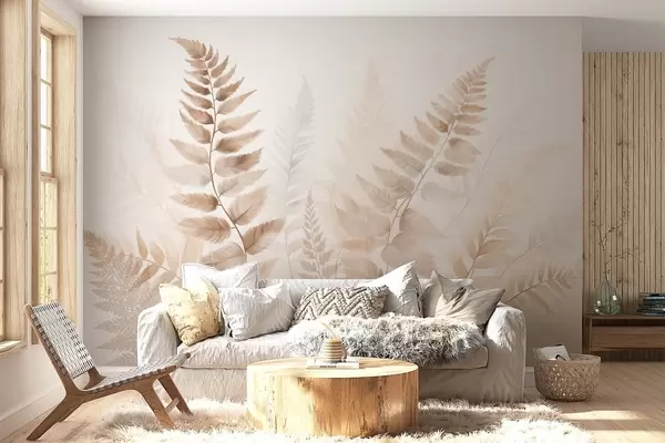 Тапете за зид Текстурирани сушени листови папрати у различитим нијансама смеђе, са меком, светлом позадином у стилу акварела бр. w09615