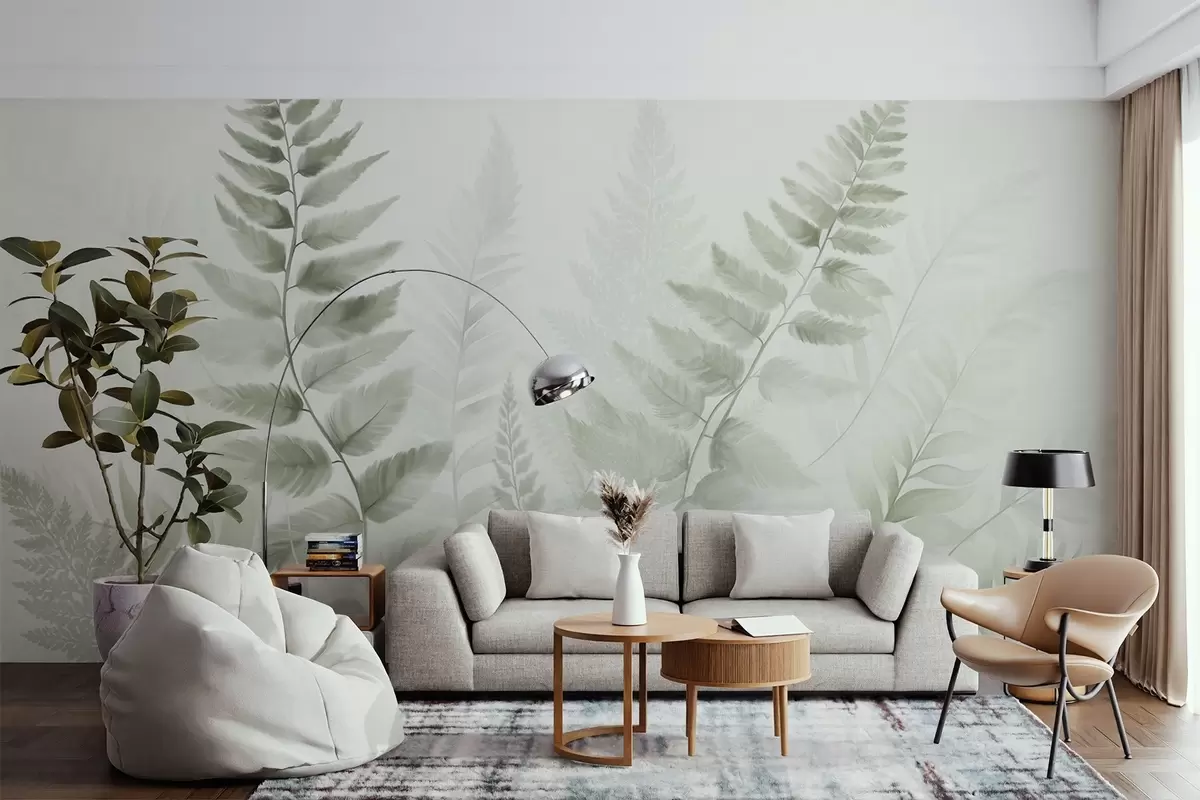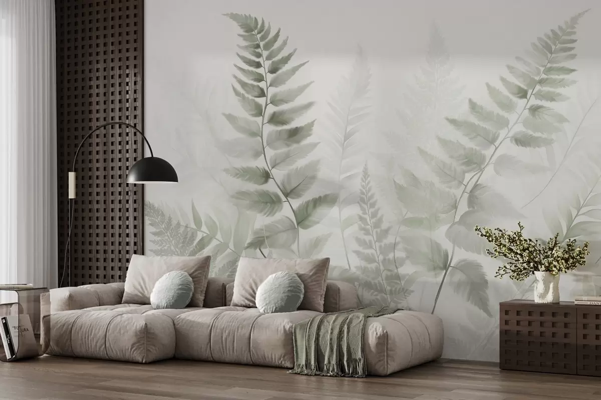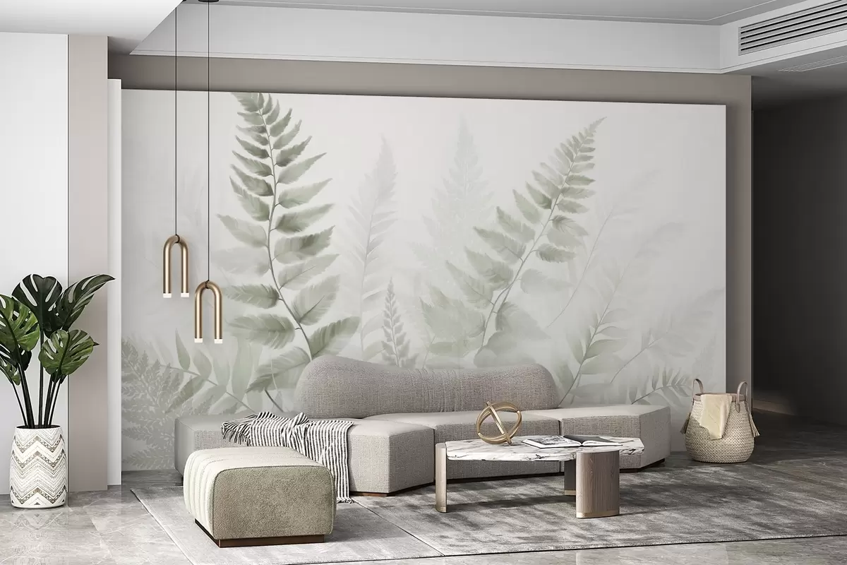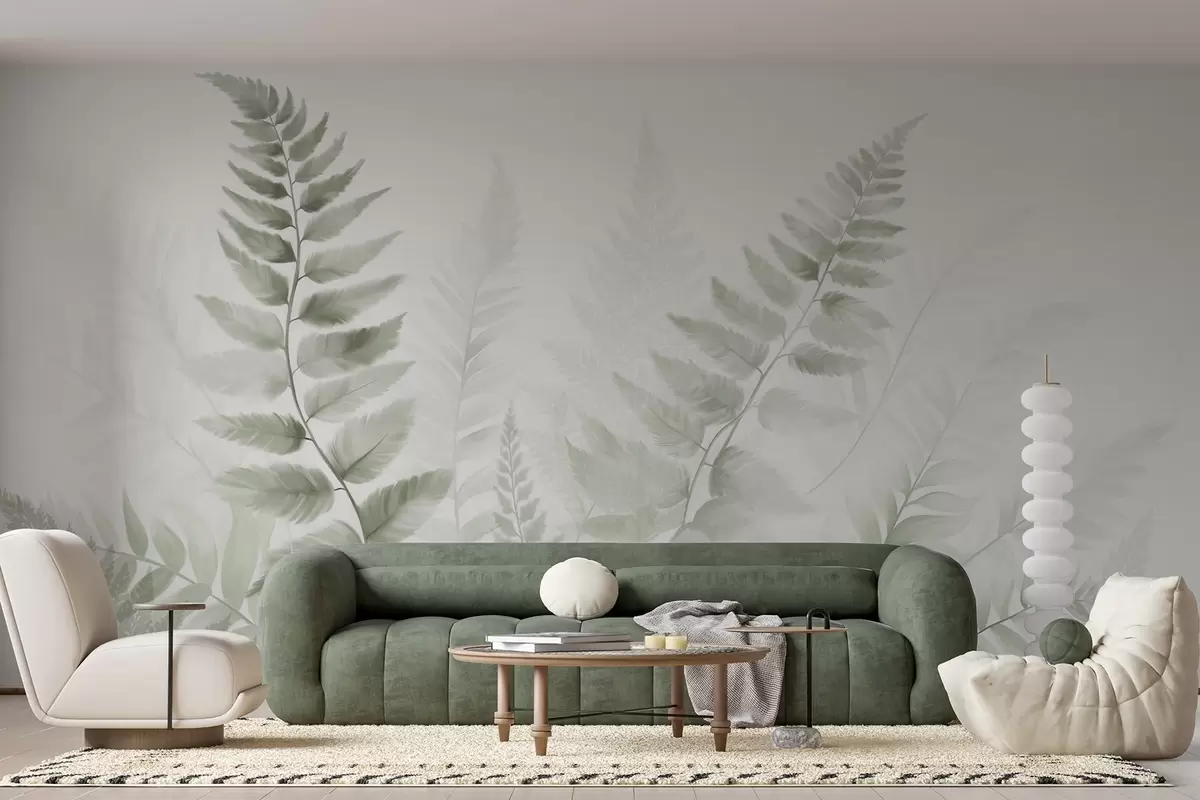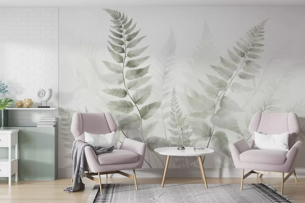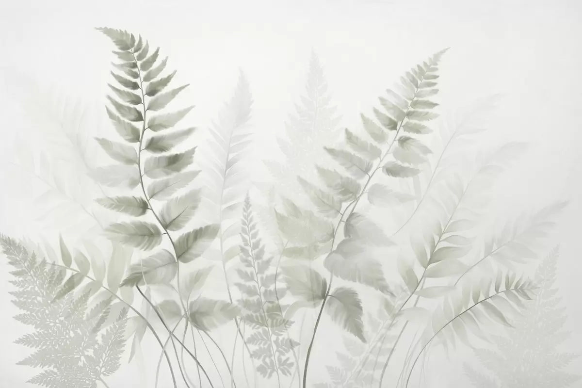 Тапете за зид Текстурирани сушени листови папрати у различитим нијансама зелене, са меком, светлом позадином у стилу акварела бр. w09615v1