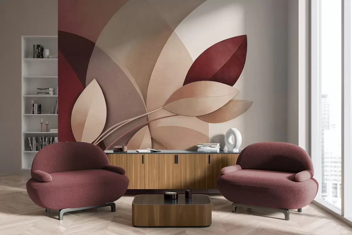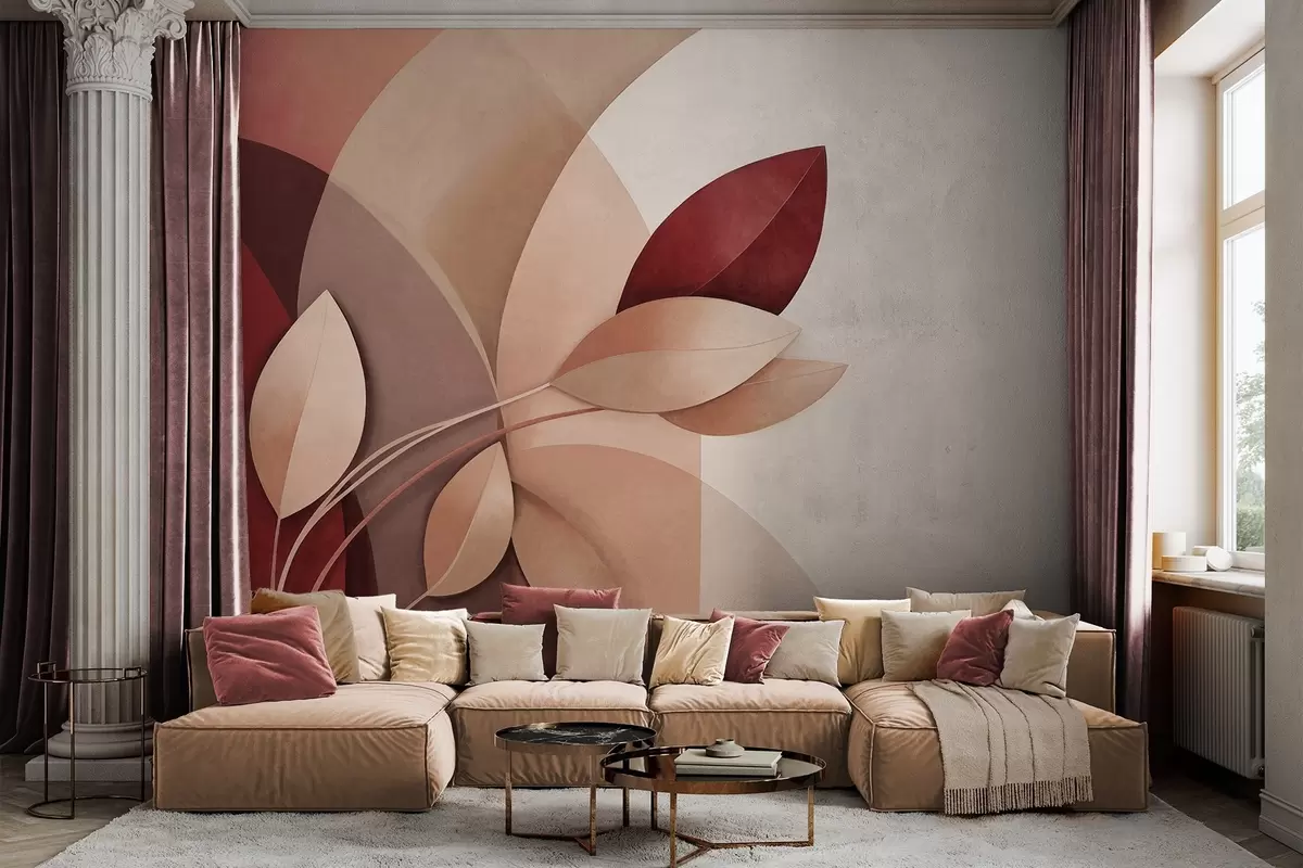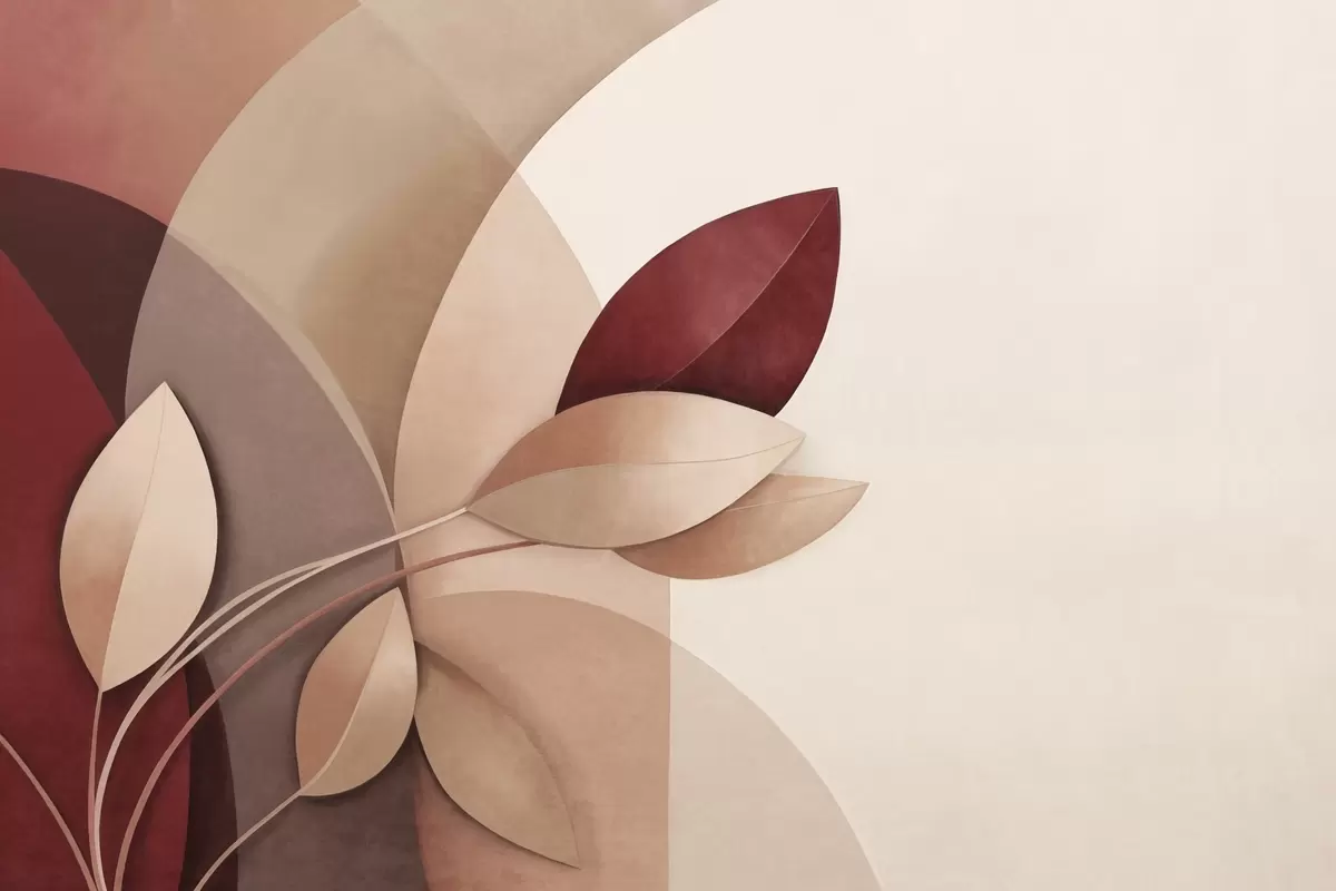 Тапете за зид Апстрактна текстурирана грана са листовима у нијансама браон, беж и црвене, на позадини апстрактних облика бр. w09618
