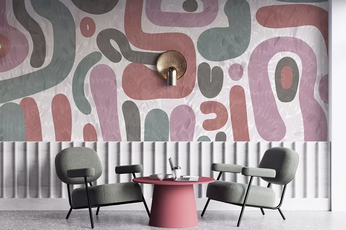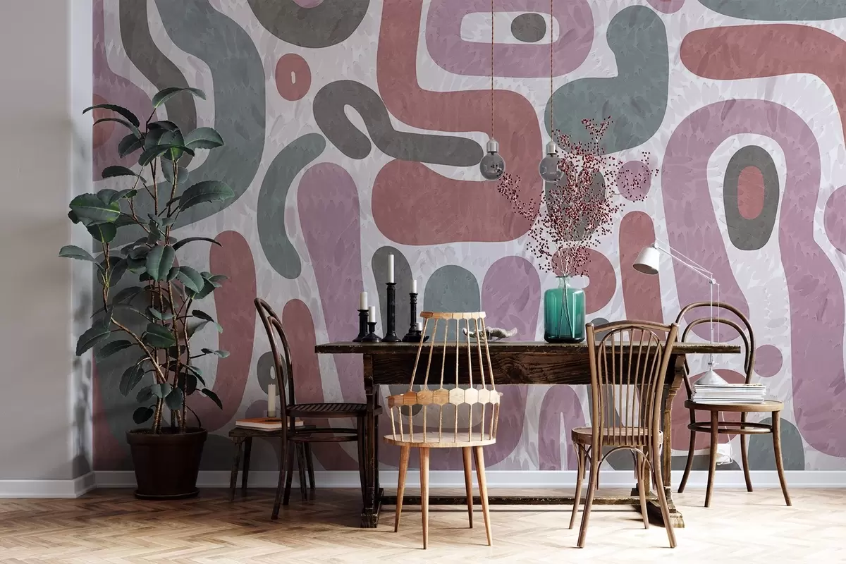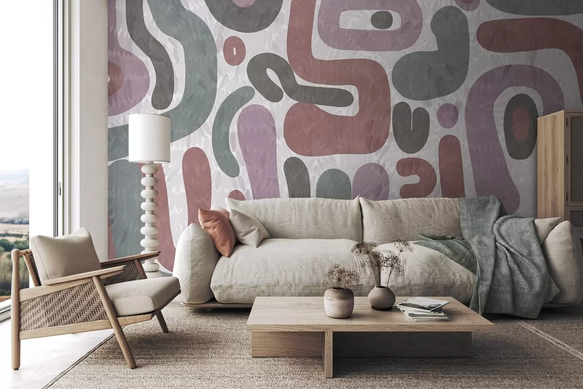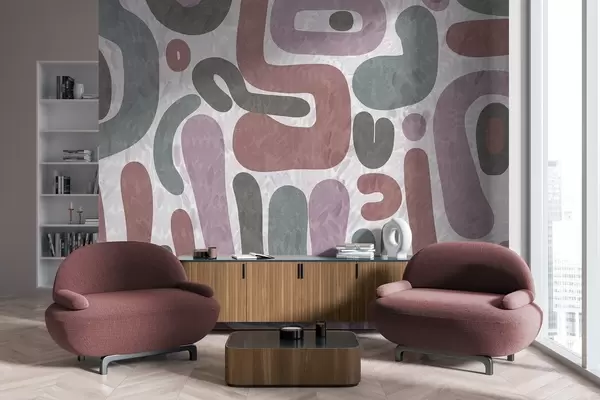 Тапете за зид Апстрактни текстурирани облици у пригушеним ружичастим, зеленим и сивим тоновима, на текстурираној позадини модерне уметности бр. w09622