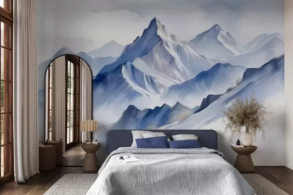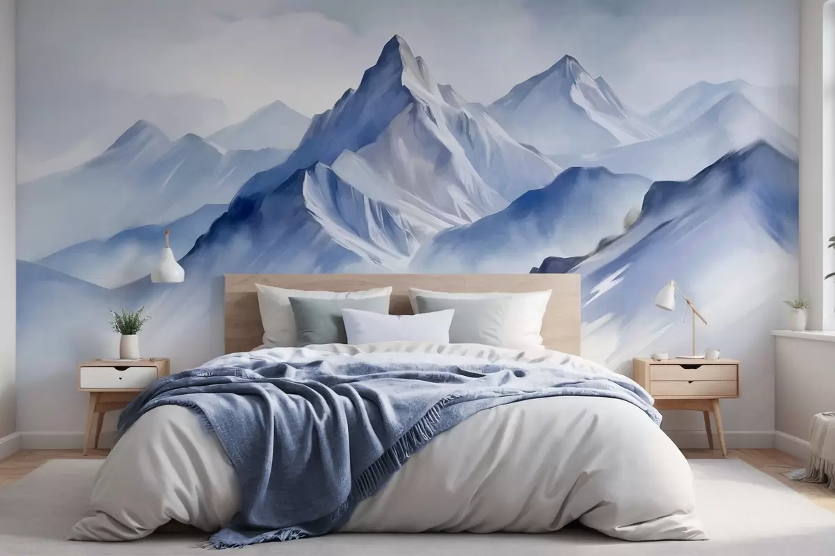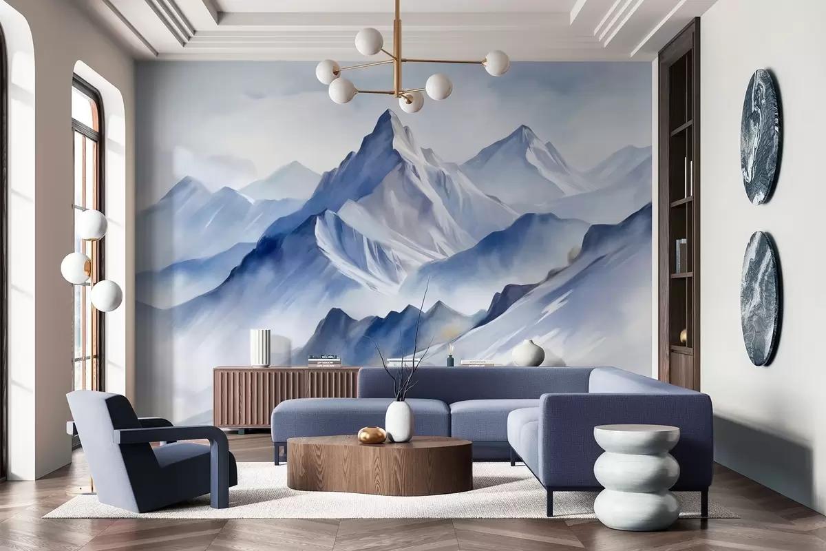 Тапете за зид Текстуриране снежне планине са меким, акварелним ефектом и палетом плаве и беле боје бр. w09630