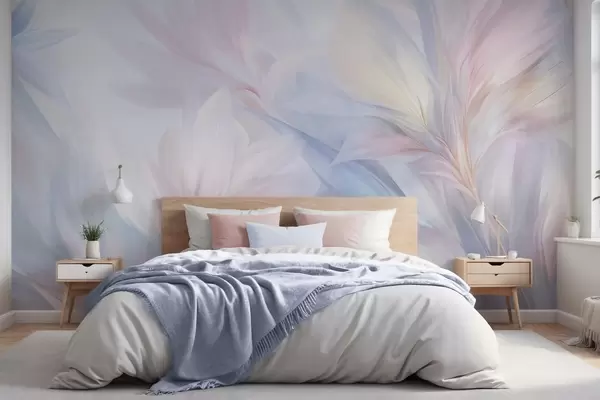 Тапете за зид Меко, пастелно обојено лишће и перје у нијансама ружичасте, плаве и жуте, апстрактни и текстурирани отисак бр. w09634