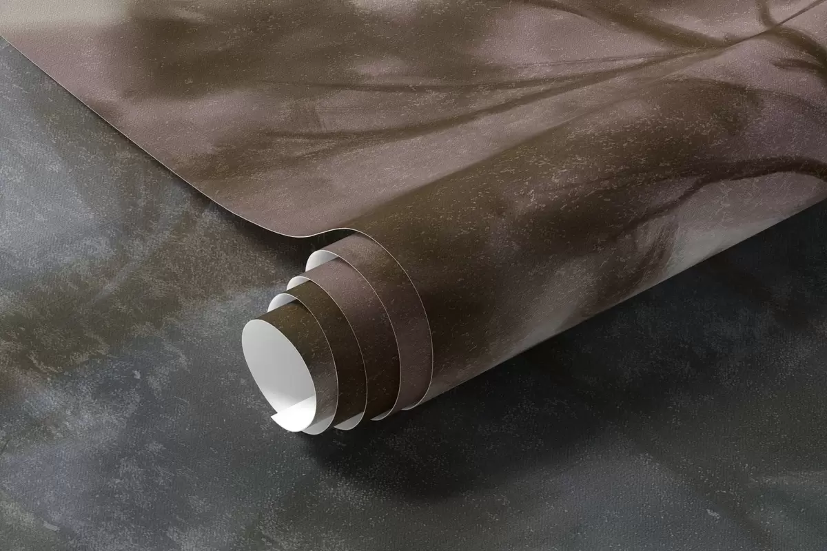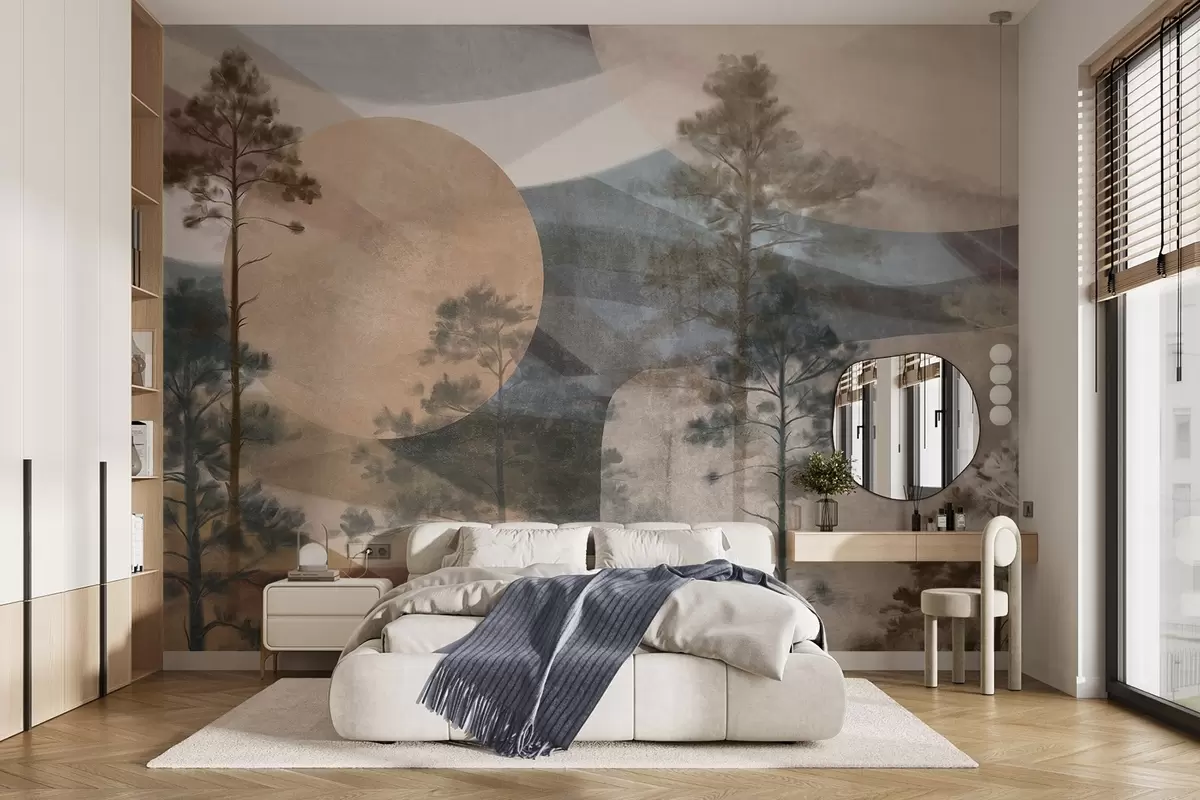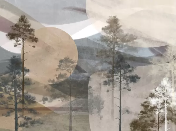 Тапете за зид Високи борови у пригушеном текстурираном пејзажу са апстрактним кружним облицима и слојевитим планинама у земљаним тоновима бр. w09636