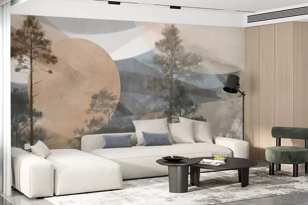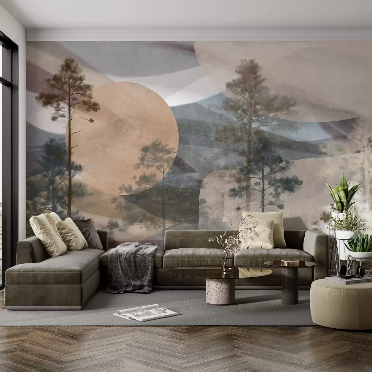 Тапете за зид Високи борови у пригушеном текстурираном пејзажу са апстрактним кружним облицима и слојевитим планинама у земљаним тоновима бр. w09636
