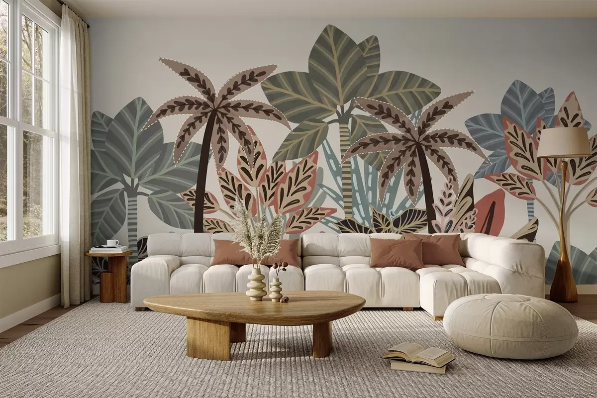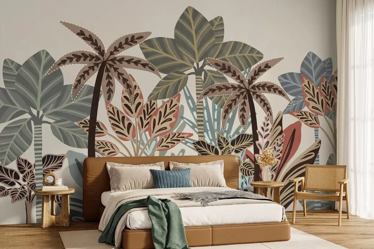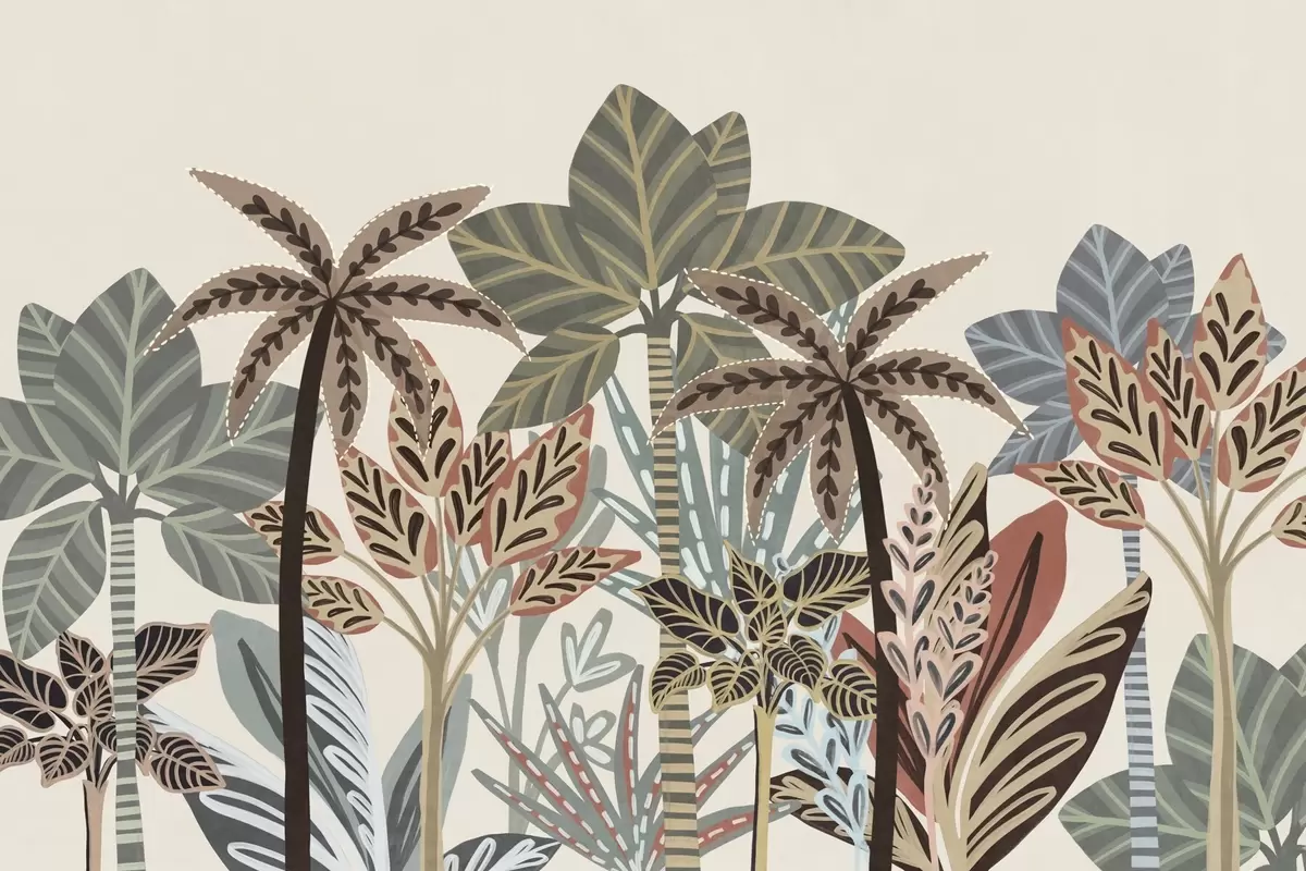 Тапете за зид Текстуриране тропске биљке и палме са пригушеним бојама у декоративном бохо стилу на кремастој позадини бр. w09639
