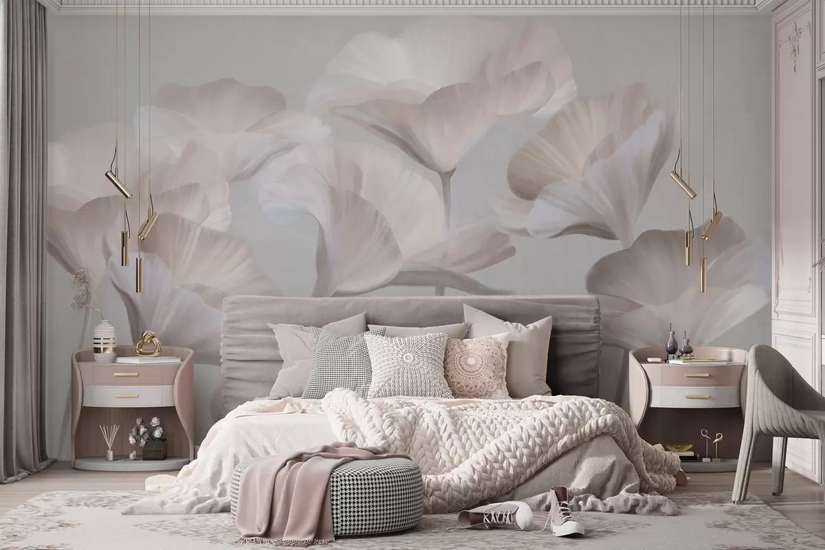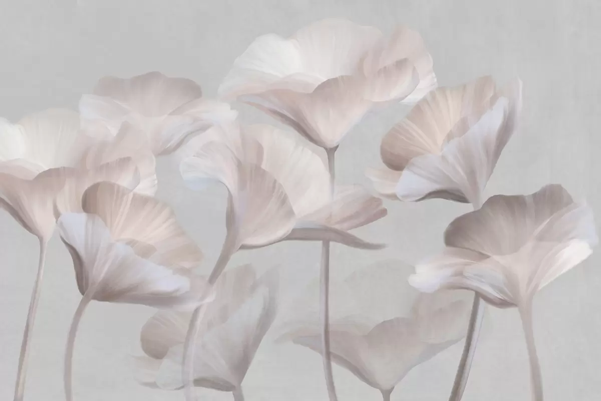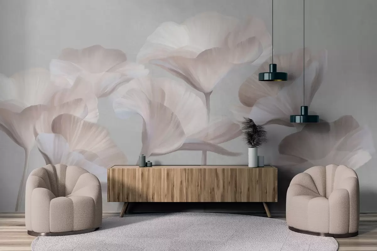 Тапете за зид Бледо бресквасто текстурирани провидни лотосови цветови са нежним латицама на пригушеној сивој позадини бр. w09640