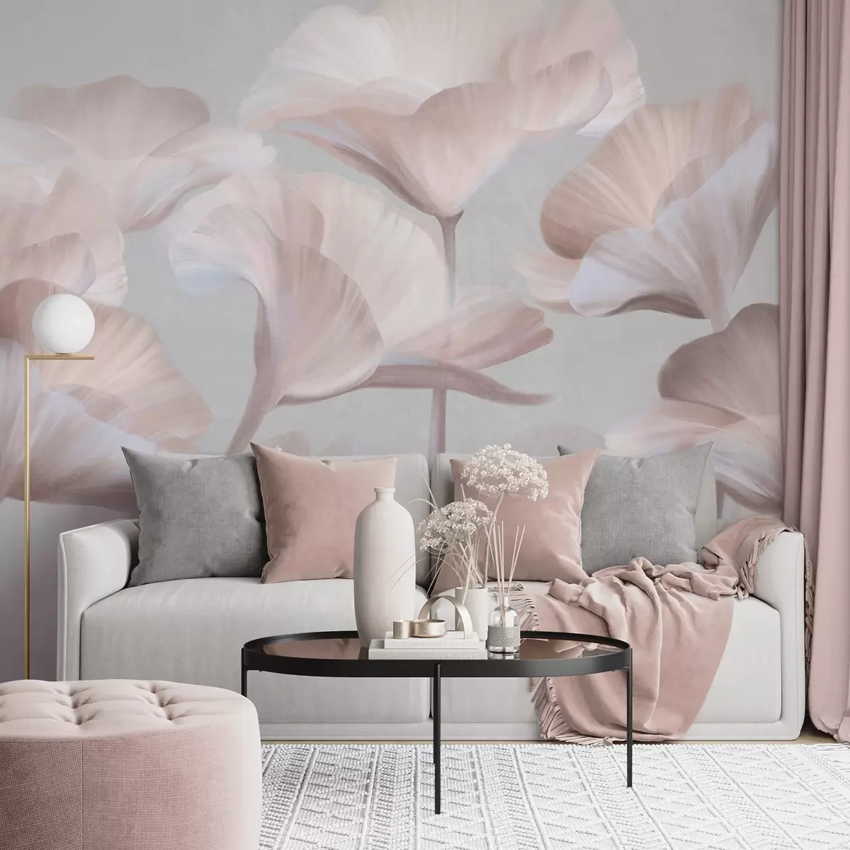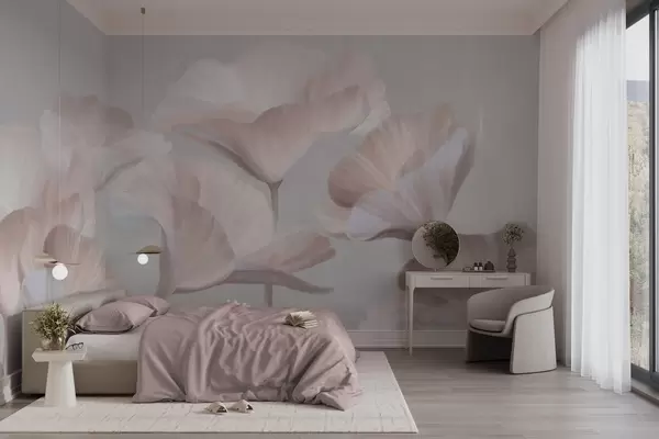 Тапете за зид Бледо бресквасто текстурирани провидни лотосови цветови са нежним латицама на пригушеној сивој позадини бр. w09640