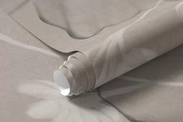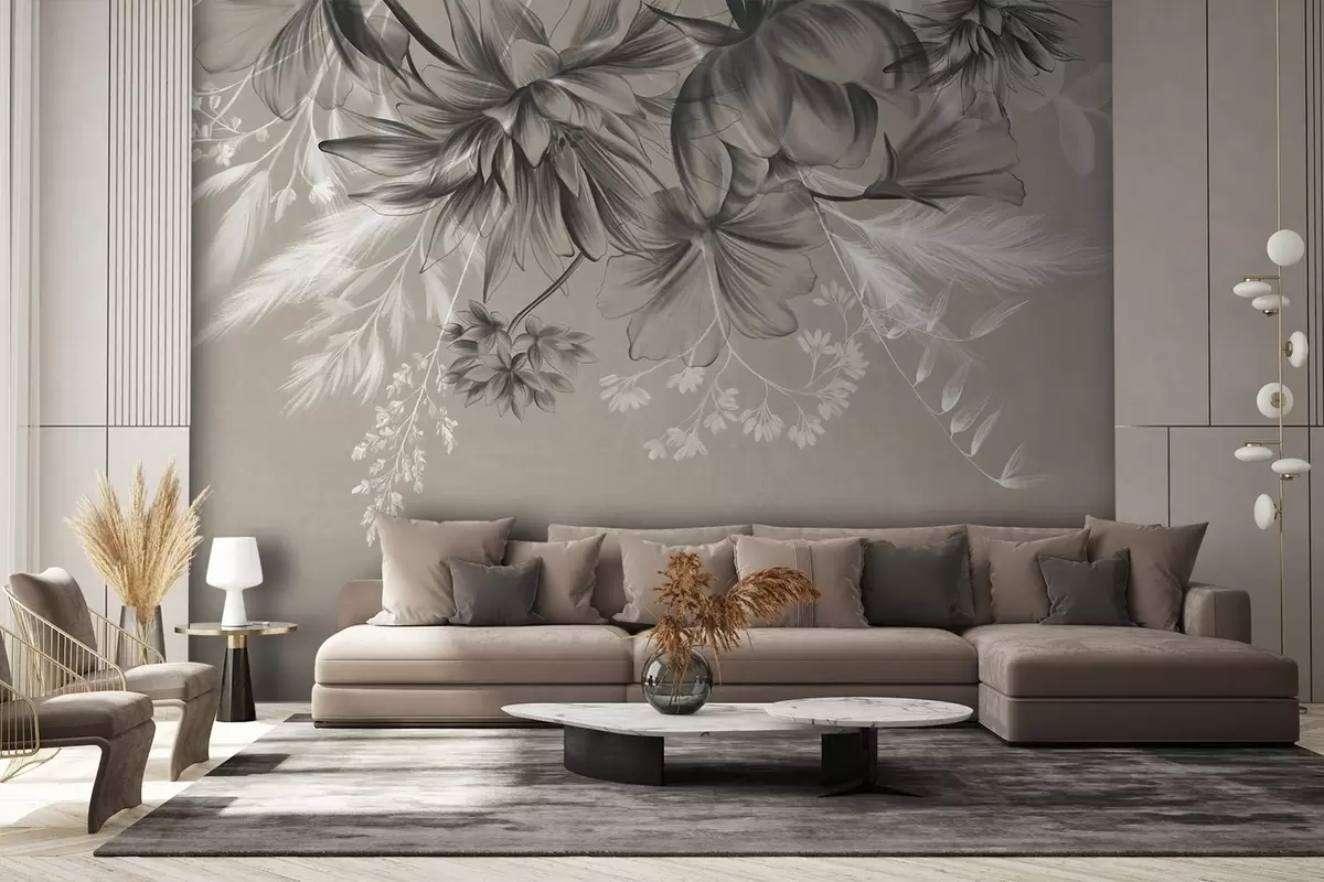 Тапете за зид Текстурирано цвеће и папрати у нијансама тамно сиве и беле на пригушеној беж позадини у стилу цртања бр. w09644