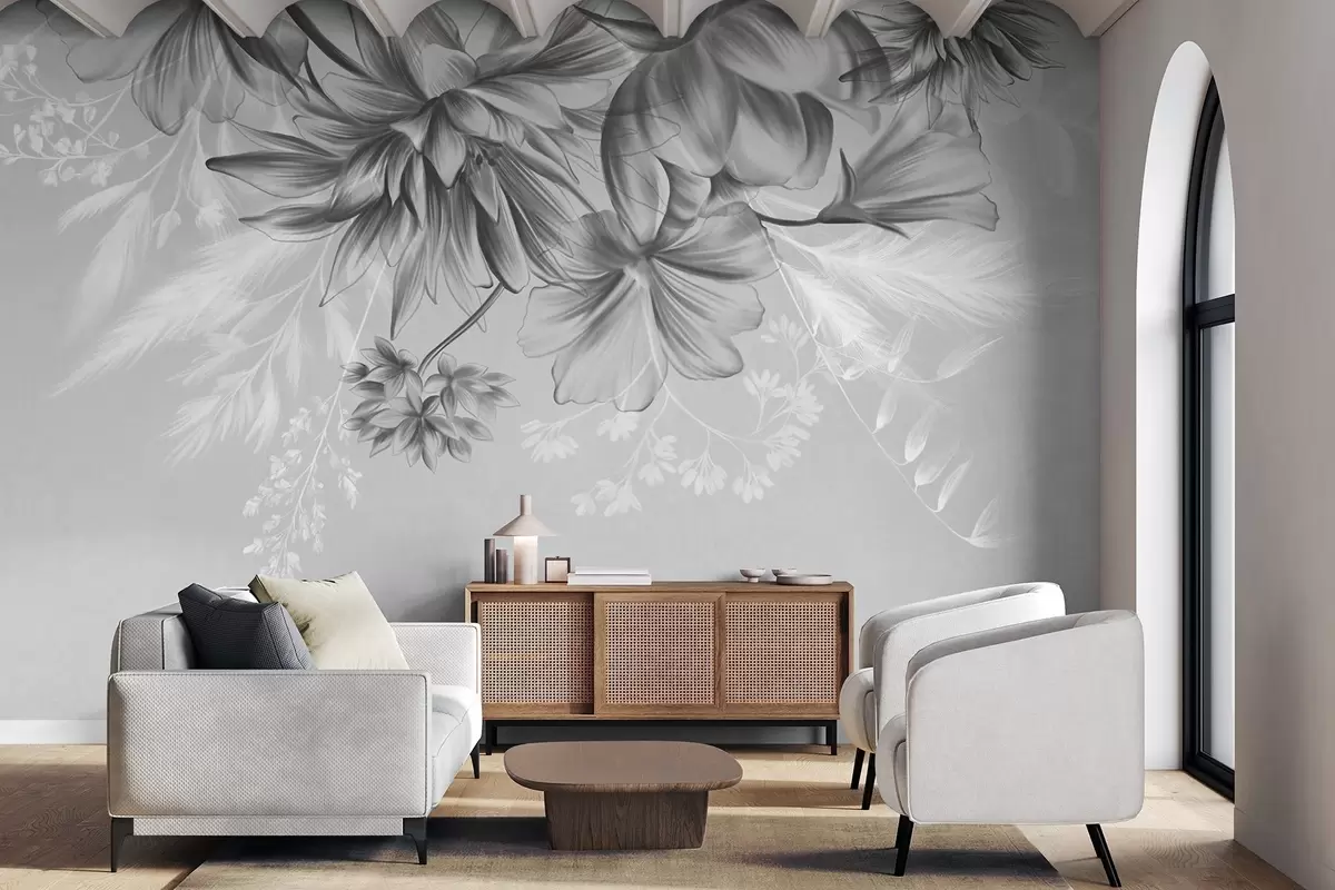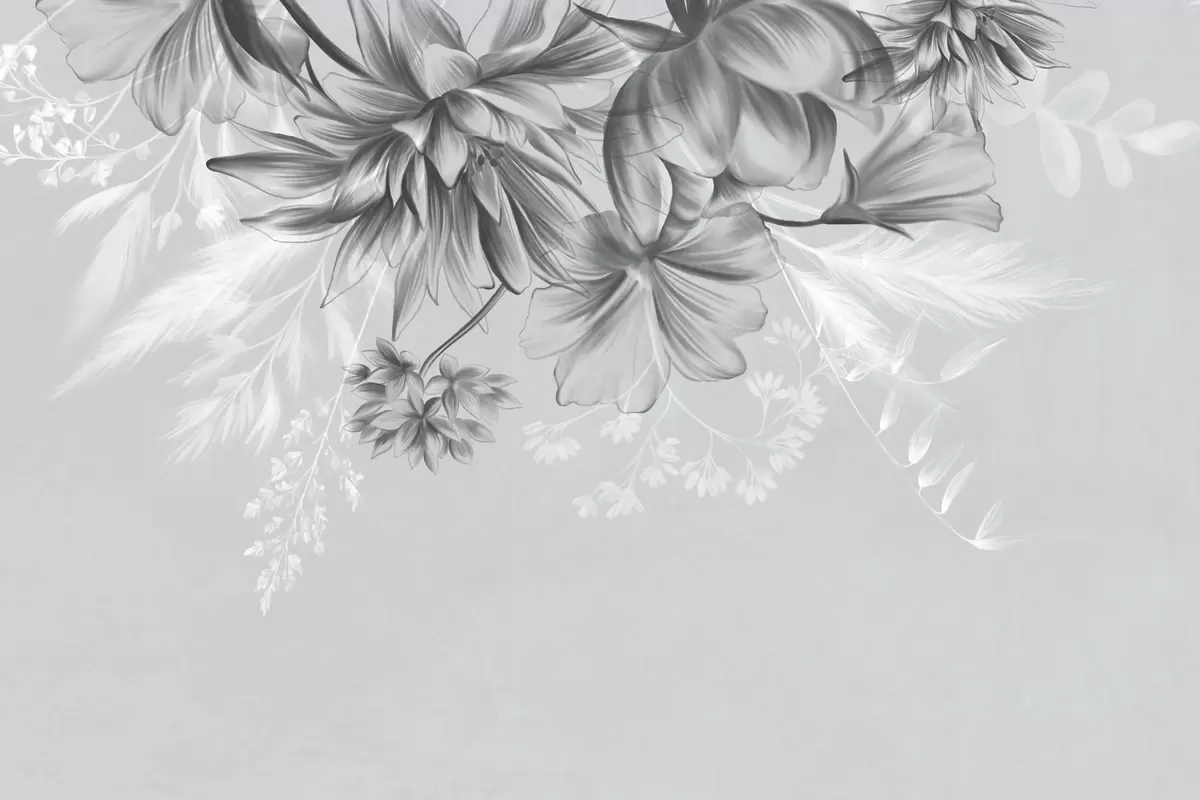 Тапете за зид Текстурирано цвеће и папрати у нијансама тамно сиве и беле на пригушеној сивој позадини, стил цртања бр. w09644v1