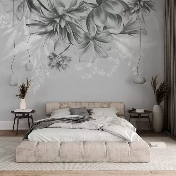 Тапете за зид Текстурирано цвеће и папрати у нијансама тамно сиве и беле на пригушеној сивој позадини, стил цртања бр. w09644v1