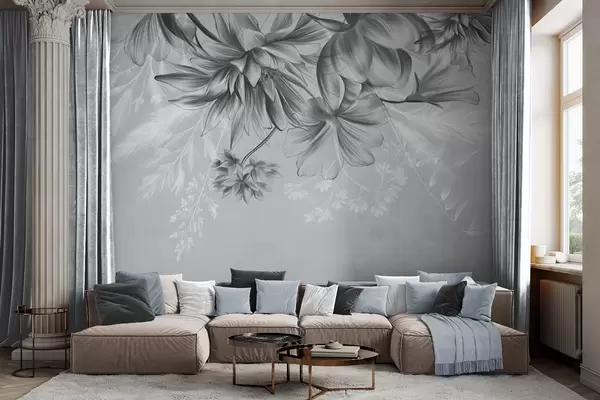 Тапете за зид Текстурирано цвеће и папрати у нијансама тамно сиве и беле на пригушеној сивој позадини, стил цртања бр. w09644v1
