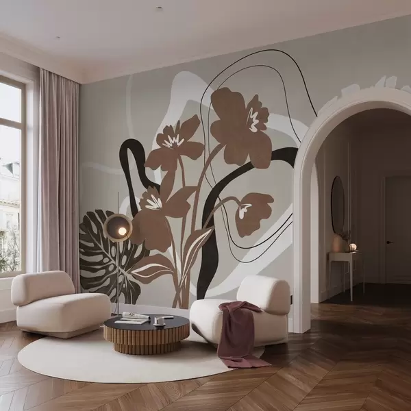 Тапете за зид Апстрактно текстурирано смеђе цвеће са белим и црним облицима на беж позадини, минималистичка уметност бр. w09645v1