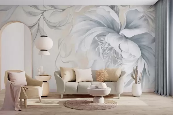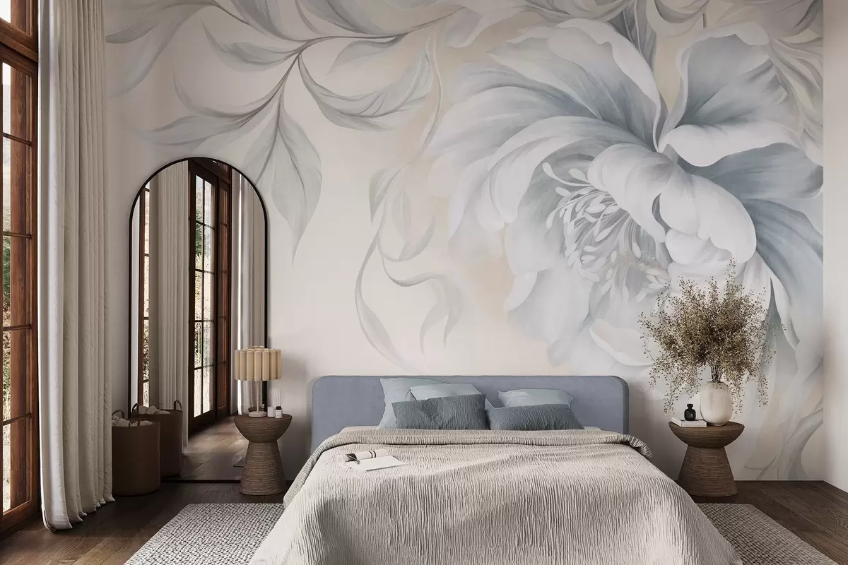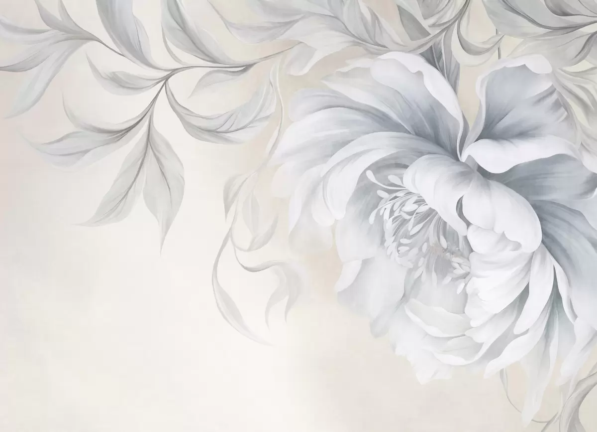 Тапете за зид Велики, текстурирани божур са нежним латицама и сивим листовима, осликан у меком стилу бр. w09647