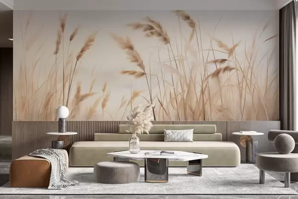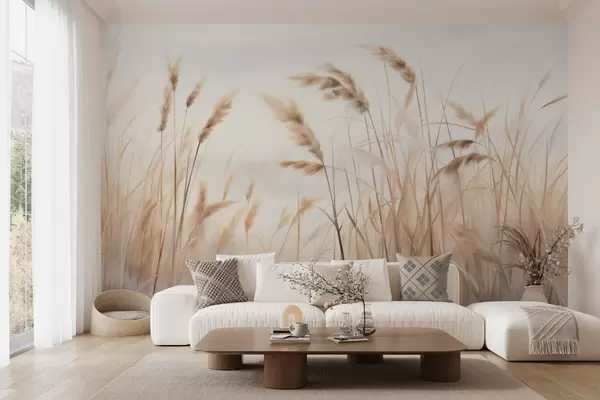 Тапете за зид Висока, текстурирана сува трава са класјевима пшенице на пољу на мекој, бледој позадини бр. w09648