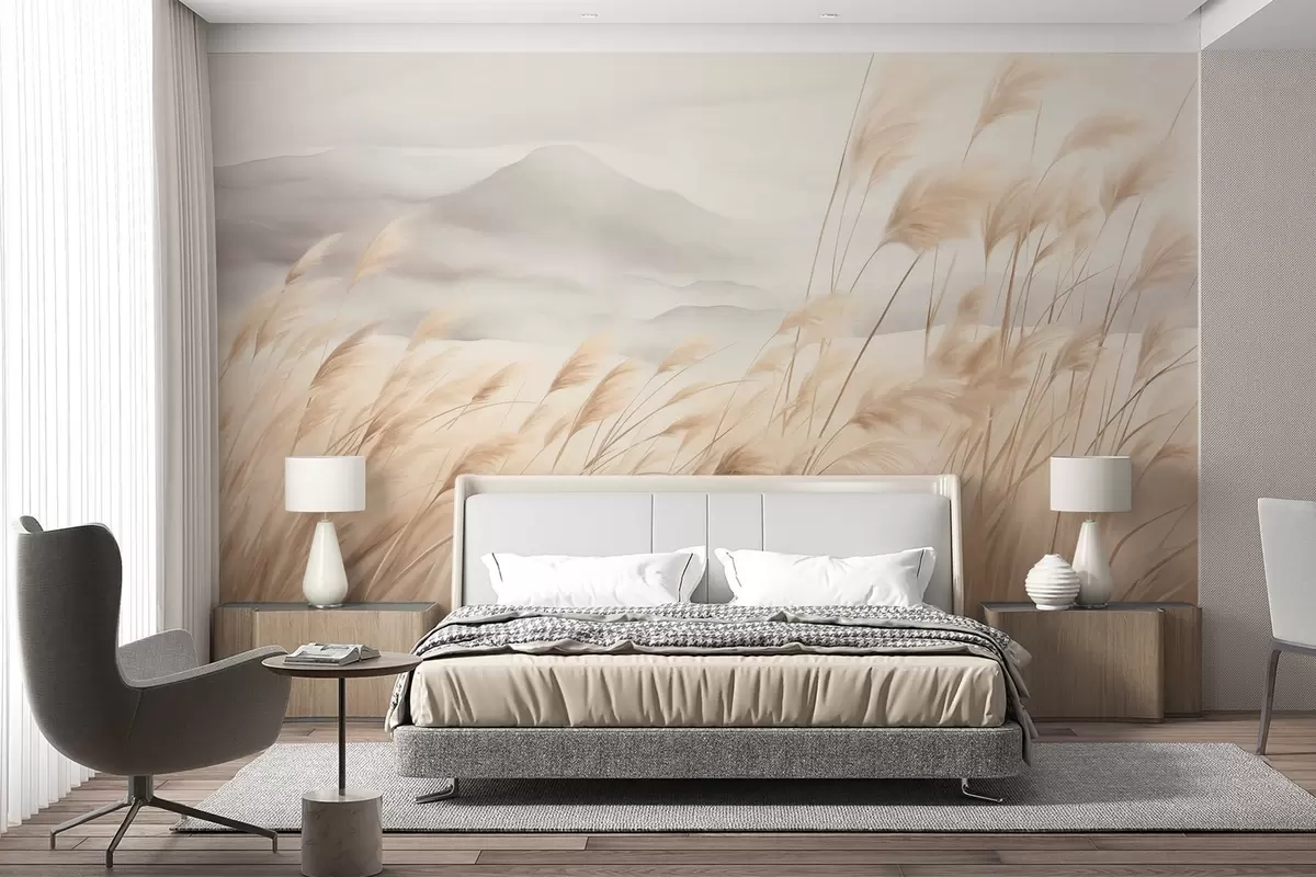 Тапете за зид Текстурирани планински пејзаж са високом, сувом травом под магловитим небом бр. w09649