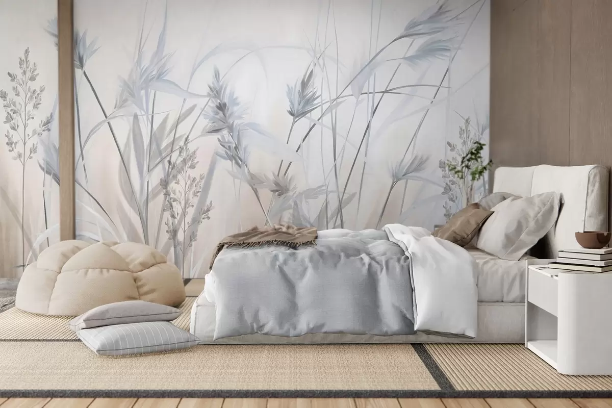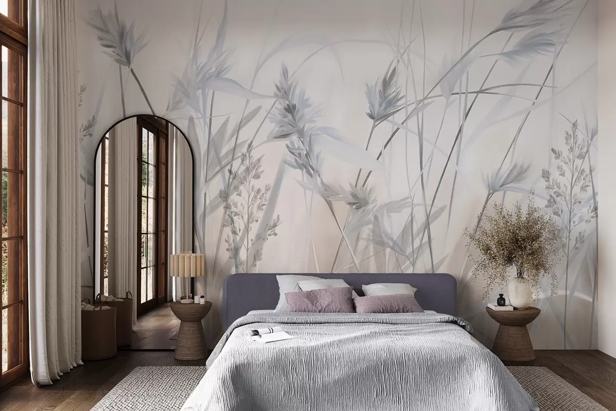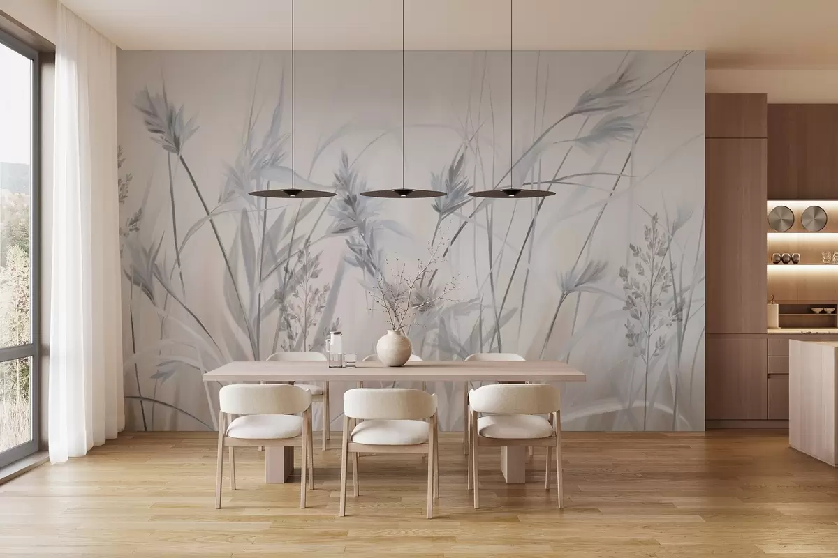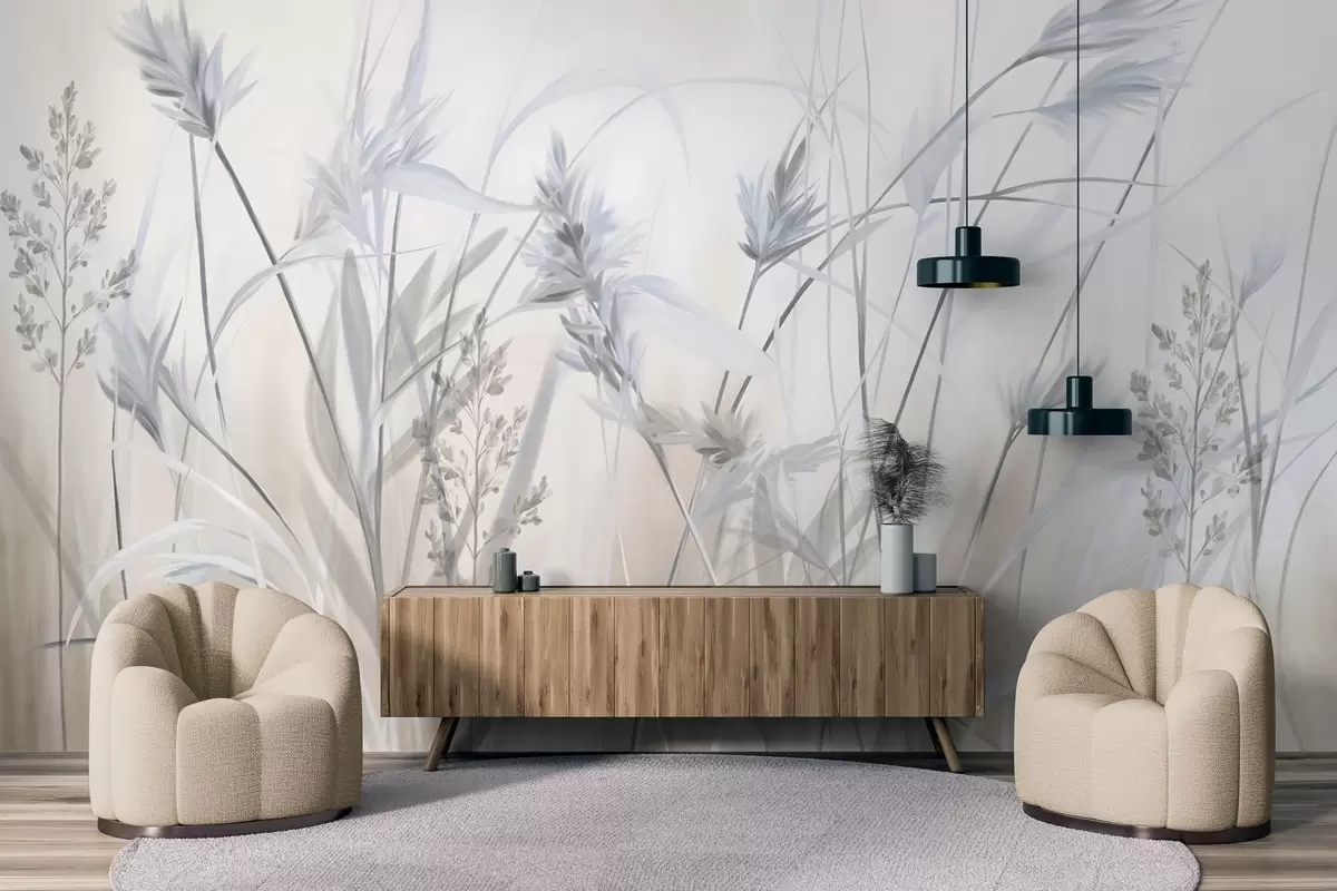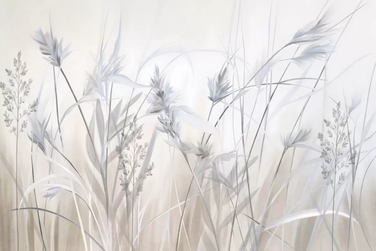 Тапете за зид Високе, суве стабљике траве са пернатим врховима у пригушеним тоновима, мека, магловита бела и беж позадина бр. w09652v1