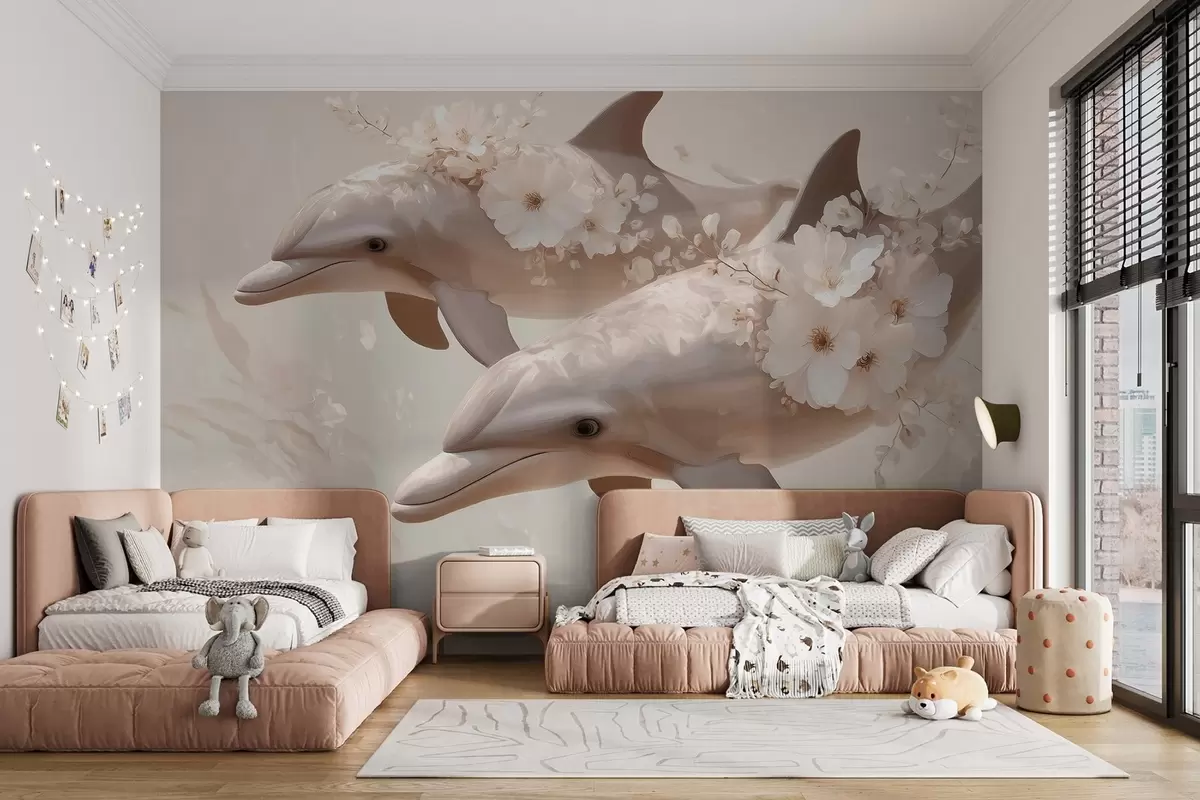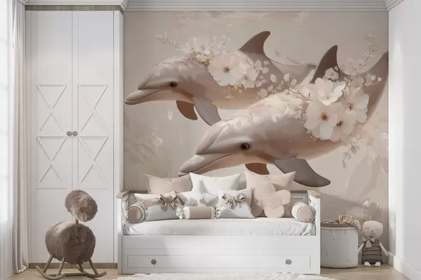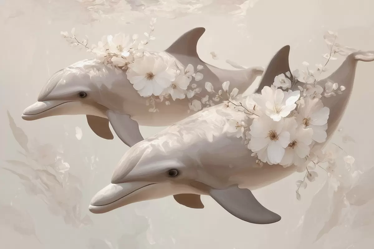 Тапете за зид Делфини у океану нежног цвећа и меке светлости бр. w09666