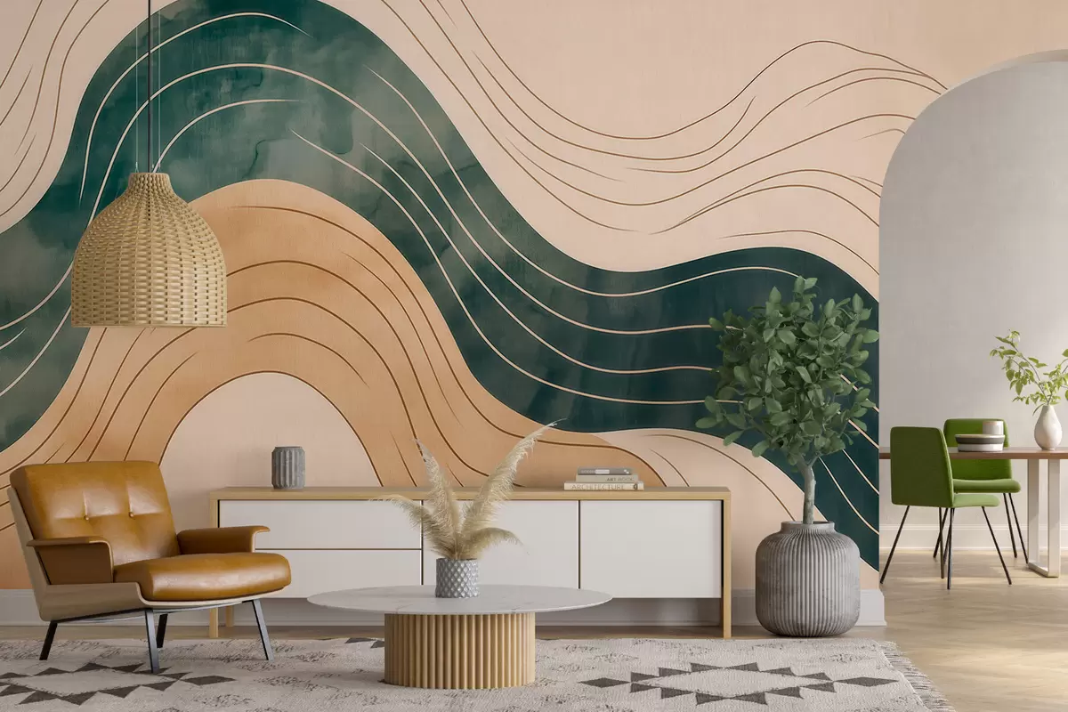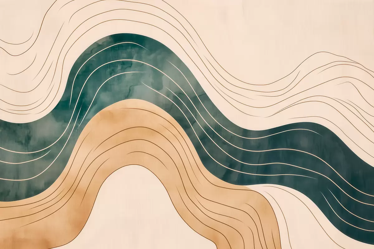 Тапете за зид Апстрактне таласасте линије у природним тоновима песка и смарагда бр. w09732
