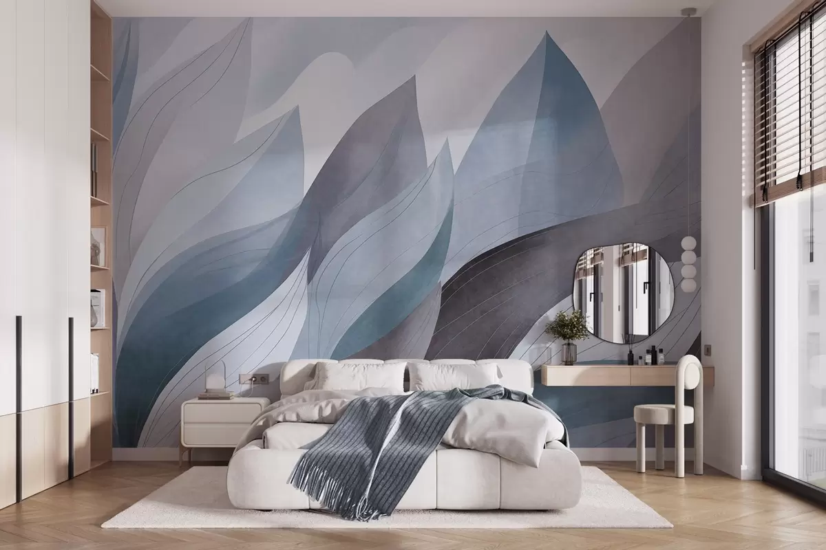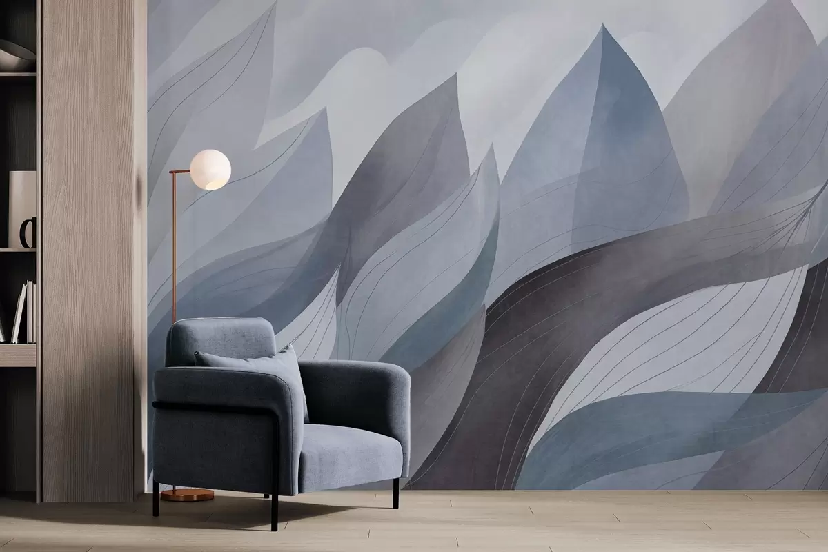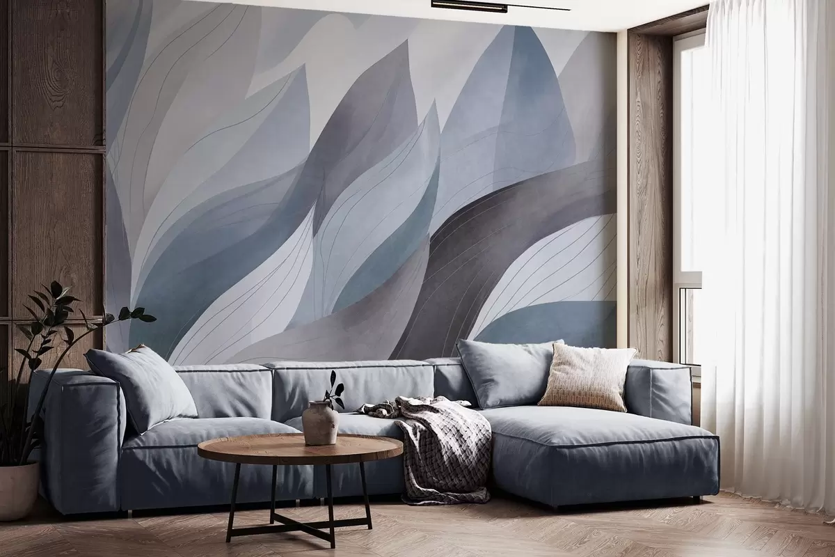 Тапете за зид Апстрактно лишће, пригушени земљани тонови плаве са нежним детаљима линија, мека текстура акварела бр. w09736v1