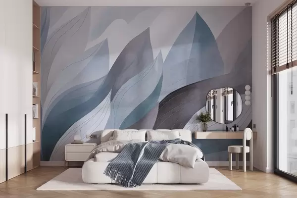 Тапете за зид Апстрактно лишће, пригушени земљани тонови плаве са нежним детаљима линија, мека текстура акварела бр. w09736v1
