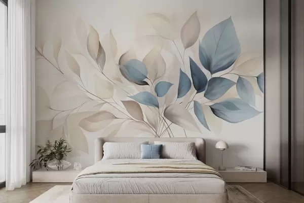 Тапете за зид Апстрактни провидни листови у нијансама плаве, беж и кремасте, текстурирана уметност бр. w09744
