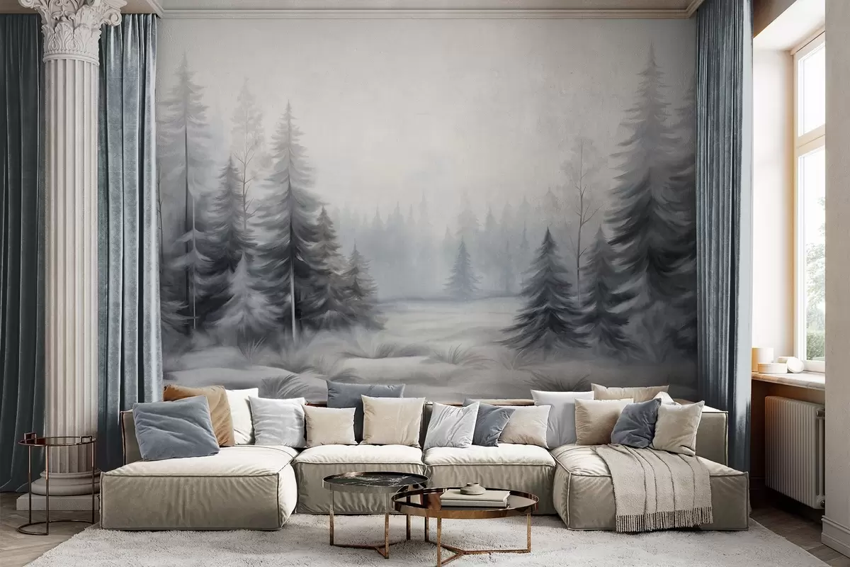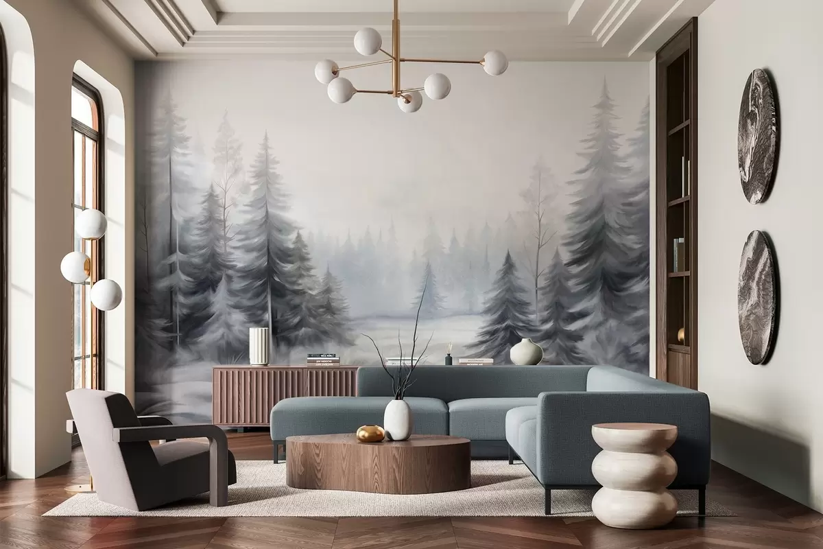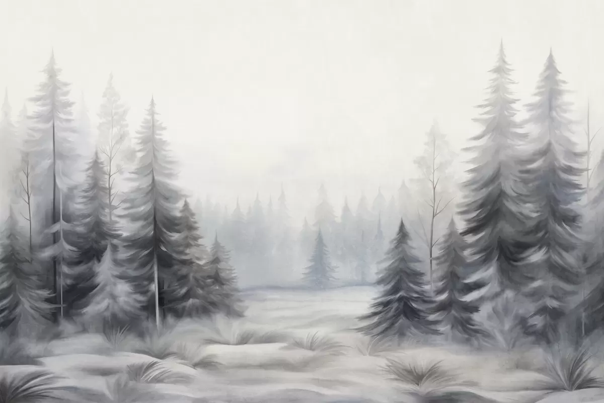 Тапете за зид Текстурирано зимско шумско дрвеће у магли, у пригушеним сивим и белим тоновима бр. w09745