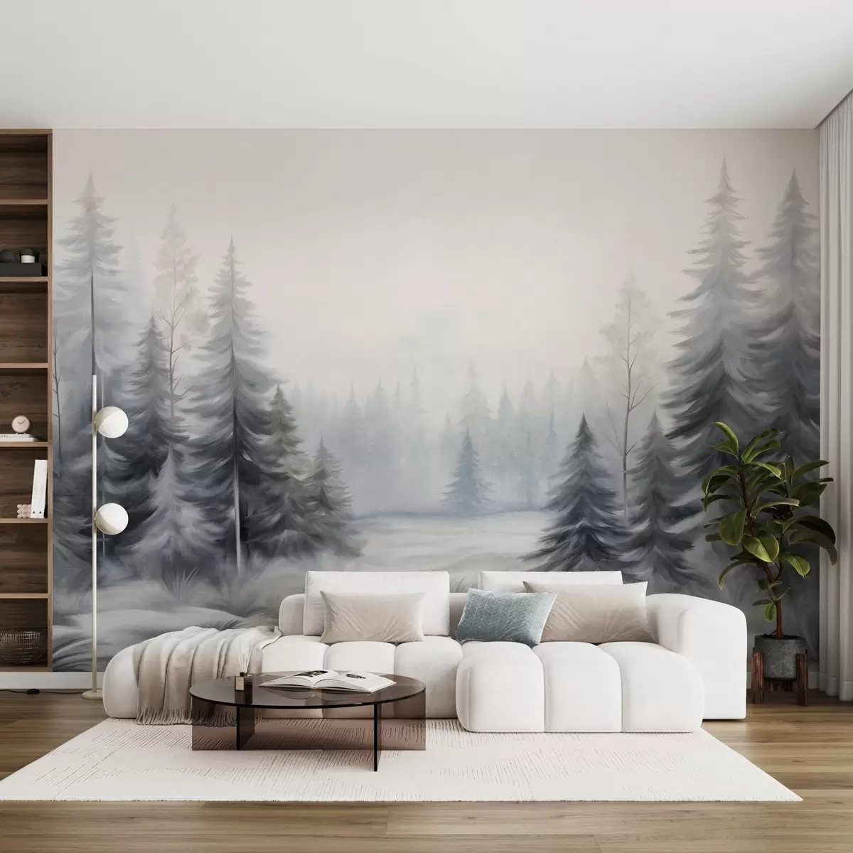 Тапете за зид Текстурирано зимско шумско дрвеће у магли, у пригушеним сивим и белим тоновима бр. w09745