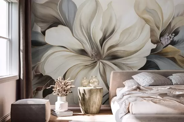 Тапете за зид Велики, кремасти цветови магнолије са смеђим и сивим листовима, меко осветљење, апстрактна позадина бр. w09749