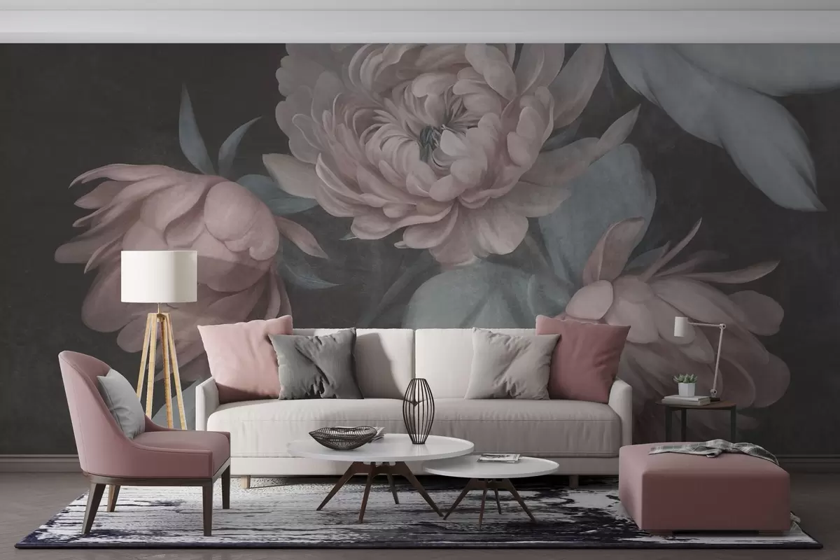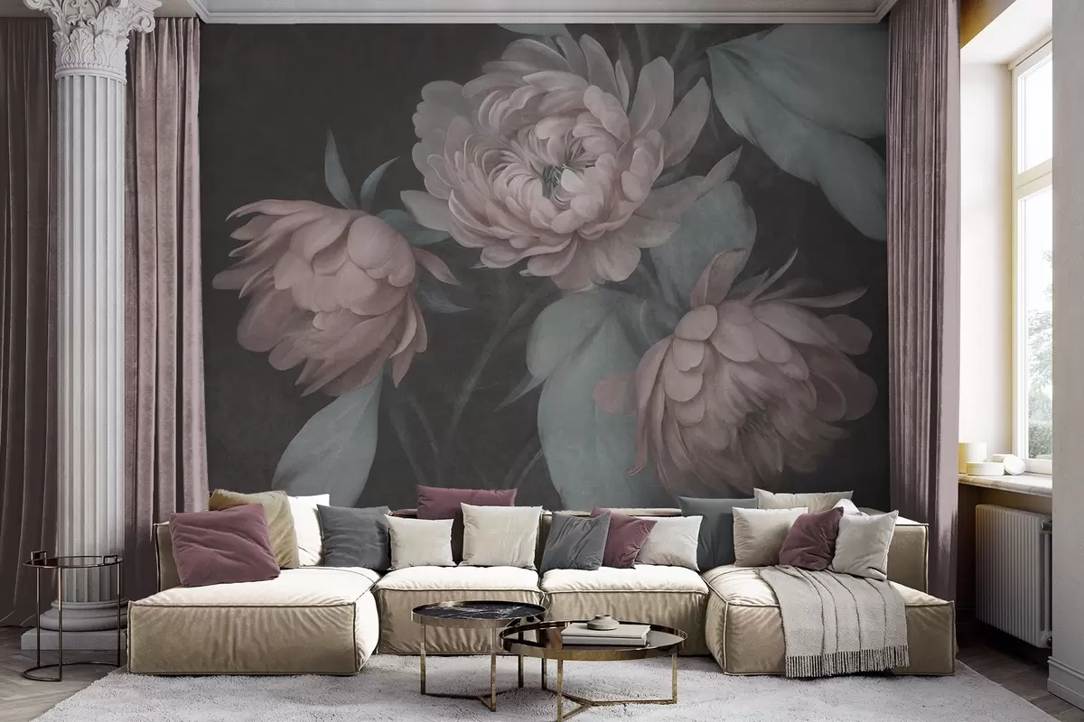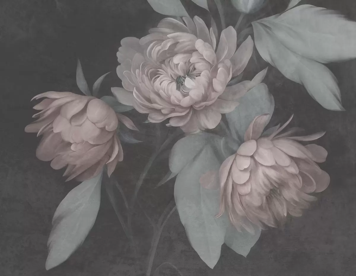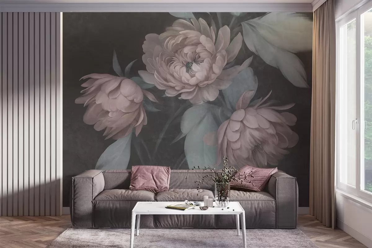 Тапете за зид Текстурирани светло ружичасти цветови божура са пригушеним зеленим листовима на тамној позадини бр. w09751v1