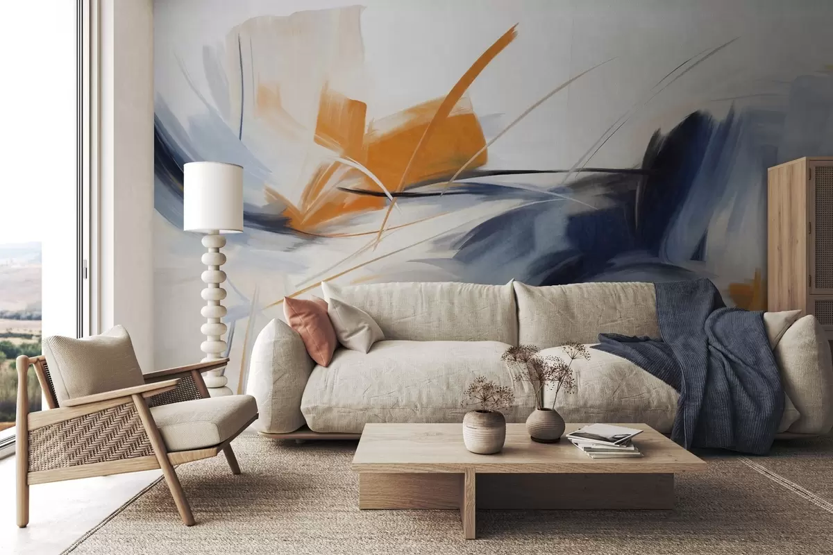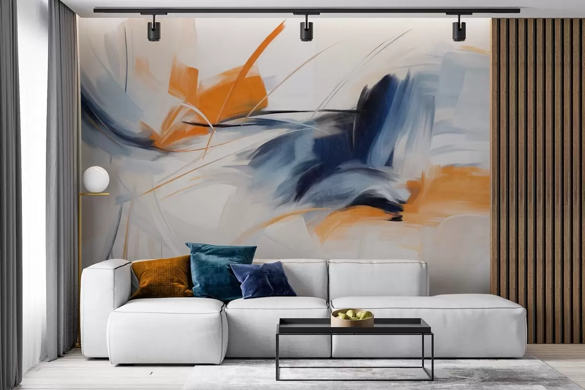 Тапете за зид Апстрактни стил сликања са наранџастим и плавим текстурираним потезима четкице бр. w09755
