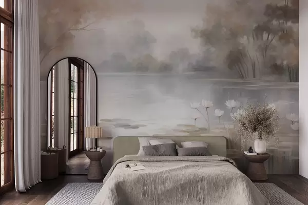 Тапете за зид Текстурирани пејзаж, језеро са белим локвањама, окружено дрвећем у пригушеним бојама бр. w09768
