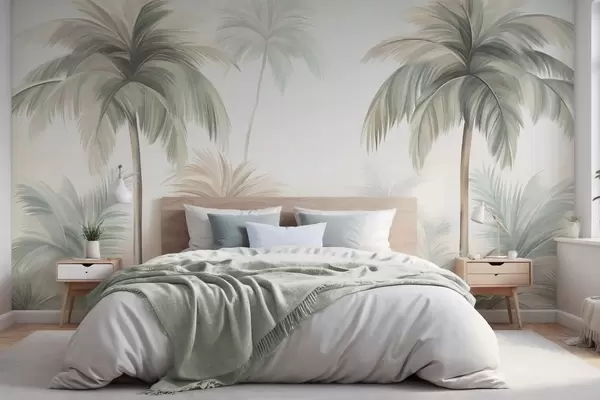 Тапете за зид Дрвеће текстуриране палмама са пригушеним зеленим и беж листовима уз меко небо бр. w09770