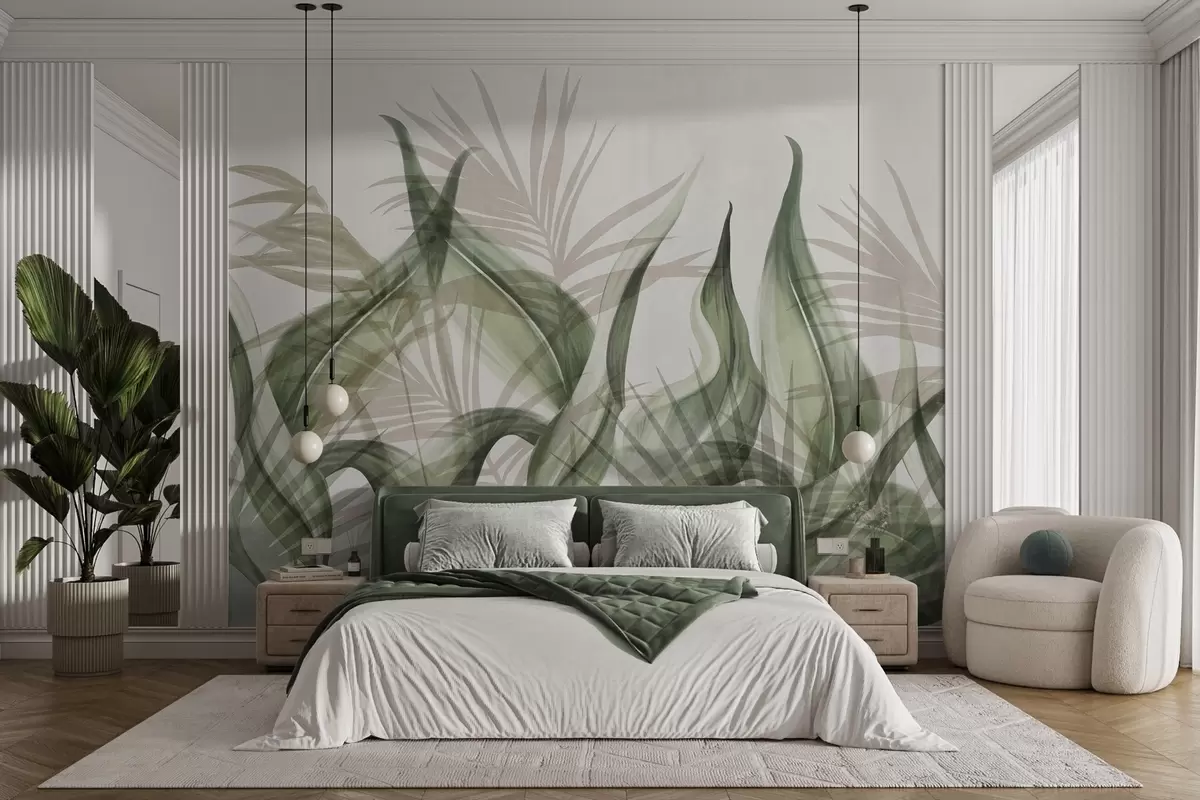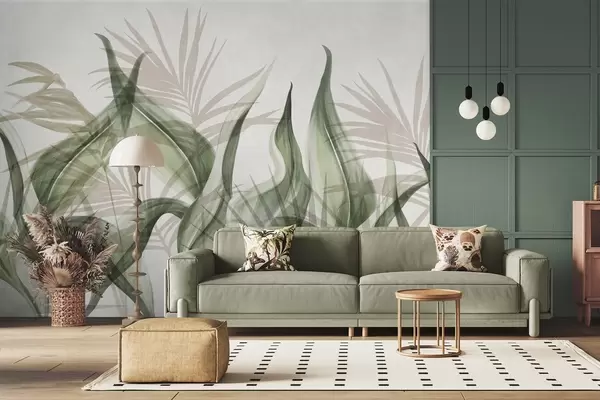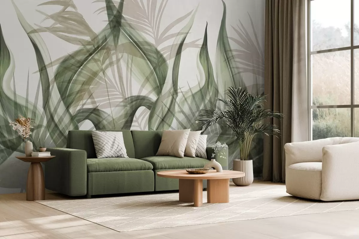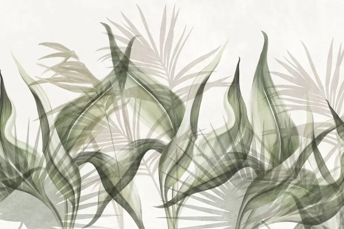 Тапете за зид Тропско лишће у нијансама беж и зелене на белој позадини, текстурирано у акварелном стилу бр. w09772v1