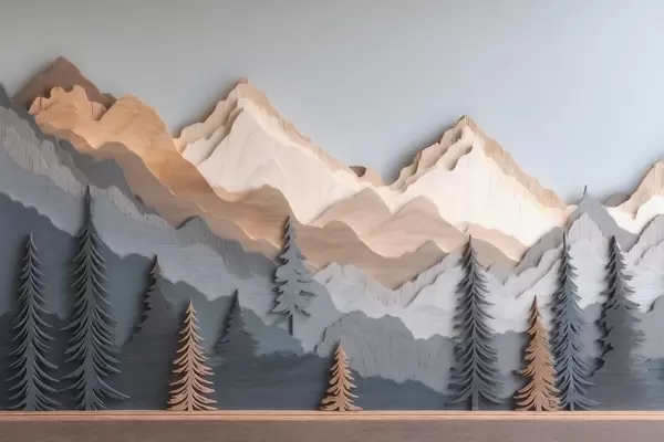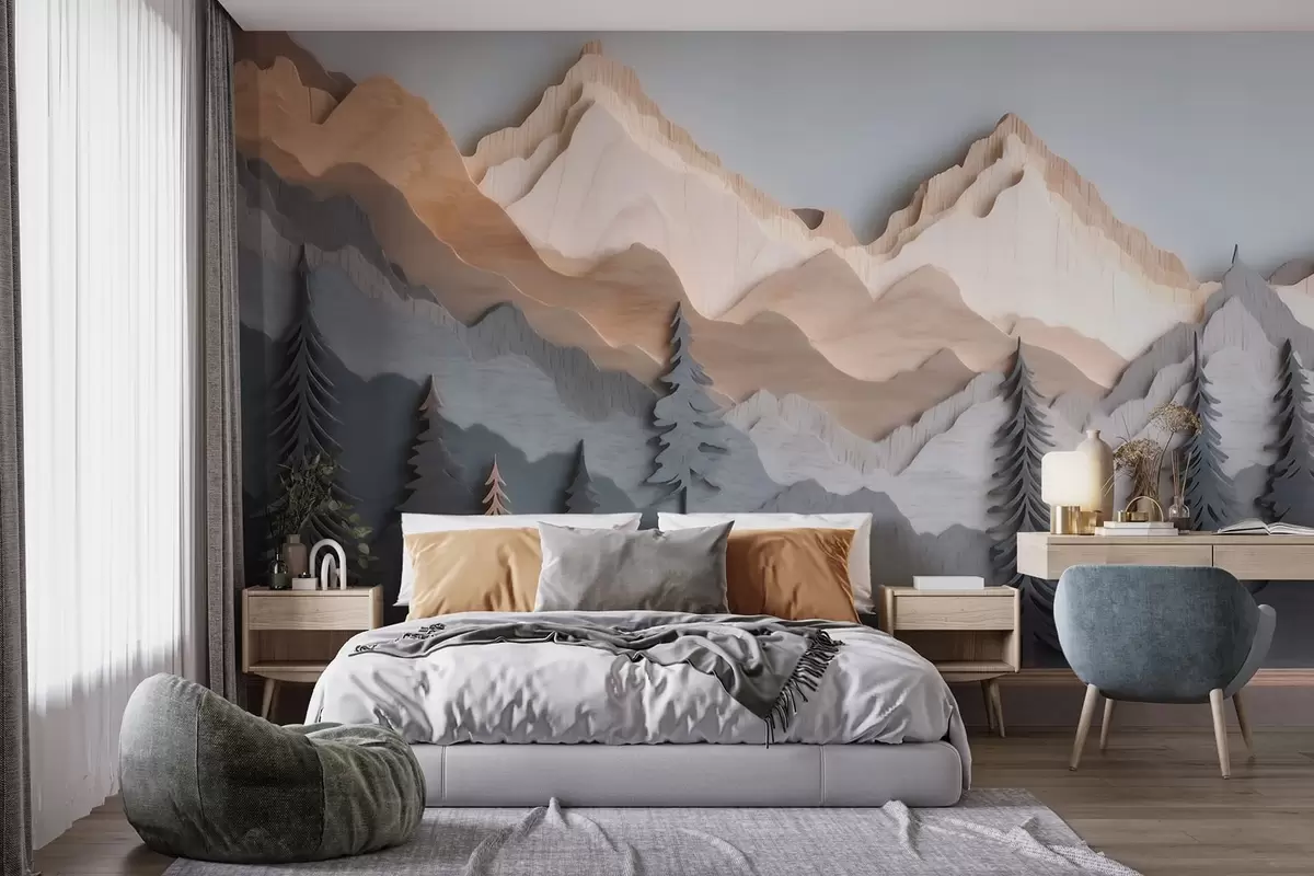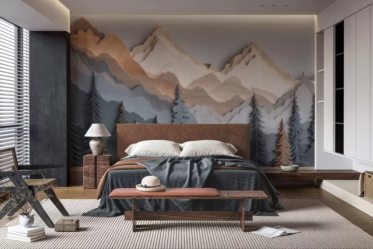 Тапете за зид Природни пејзаж са боровима и планинама у стилу резбареног дрвета бр. w09793
